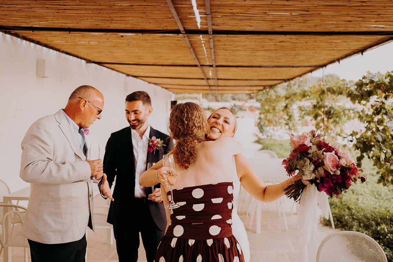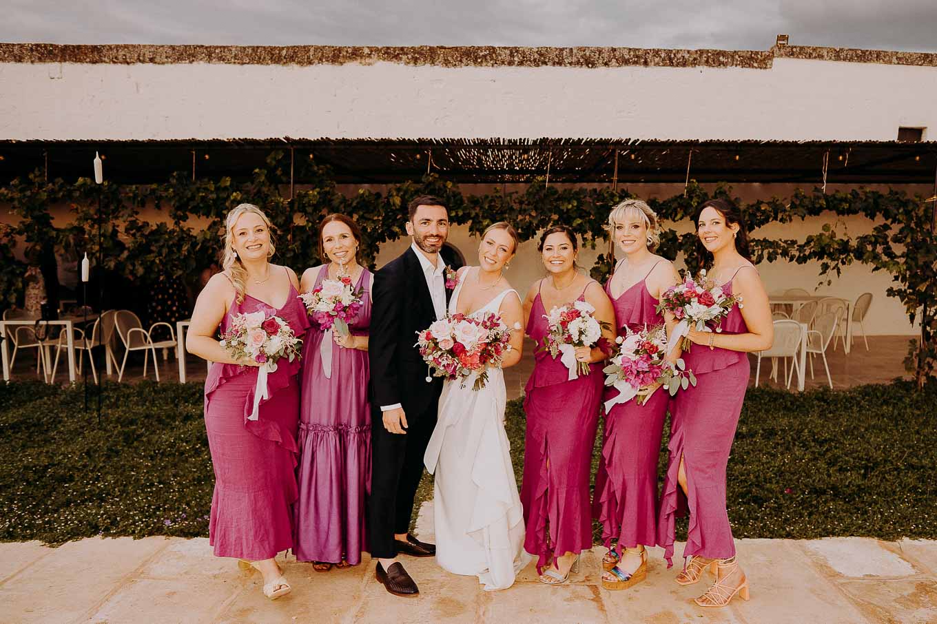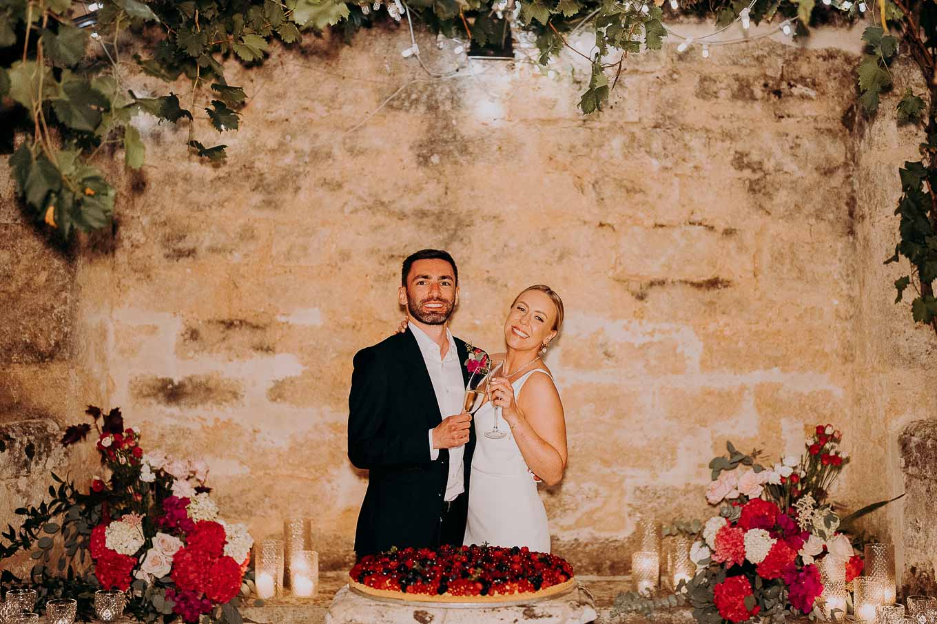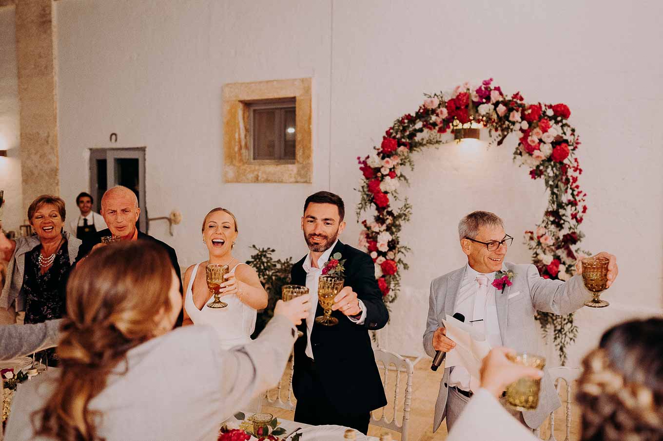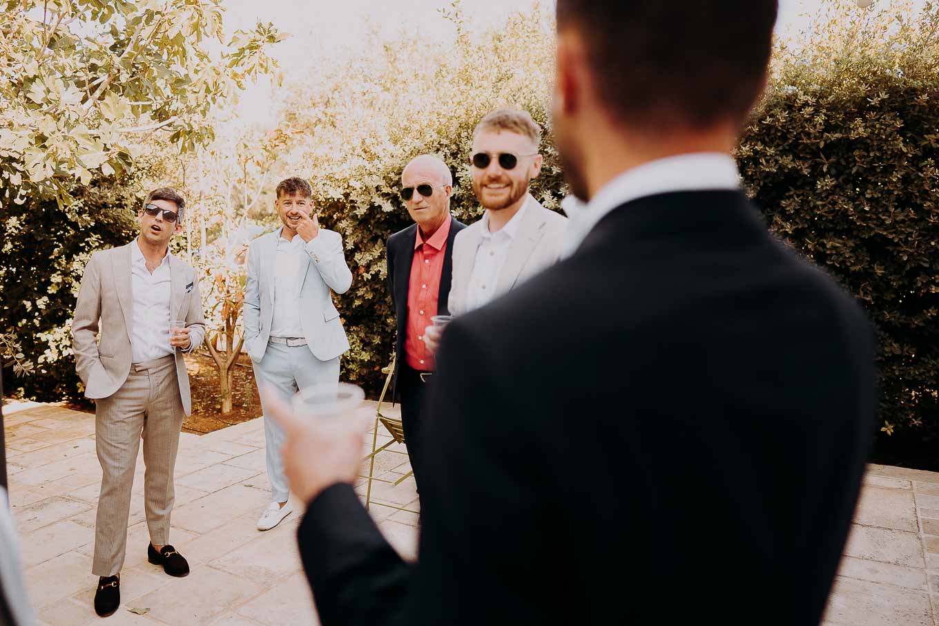 Dopo il rito, gli ospiti sono stati accolti con un elegante rinfresco, servito negli spazi esterni della masseria. Prodotti locali, bollicine e piccoli assaggi gourmet hanno accompagnato la socializzazione in un contesto rilassato e curato. Nel frattempo, Aston e Lucy si sono concessi qualche scatto di coppia tra i tanti scorci offerti dalla Masseria: dal frantoio in pietra alla piscina, dai viali alberati alle terrazze panoramiche, ogni angolo raccontava una storia e diventava sfondo perfetto per le loro foto.