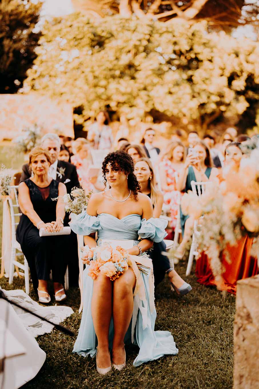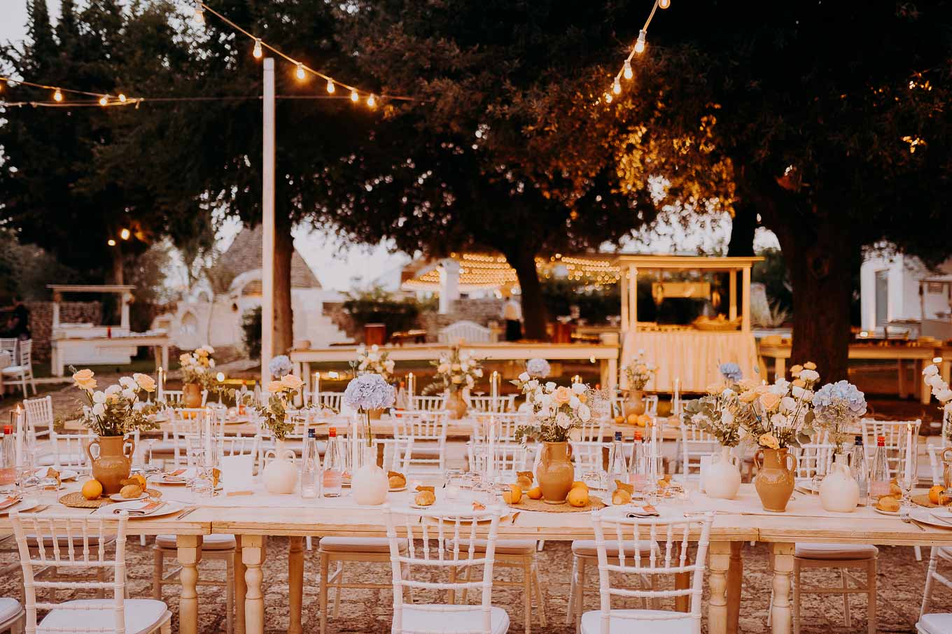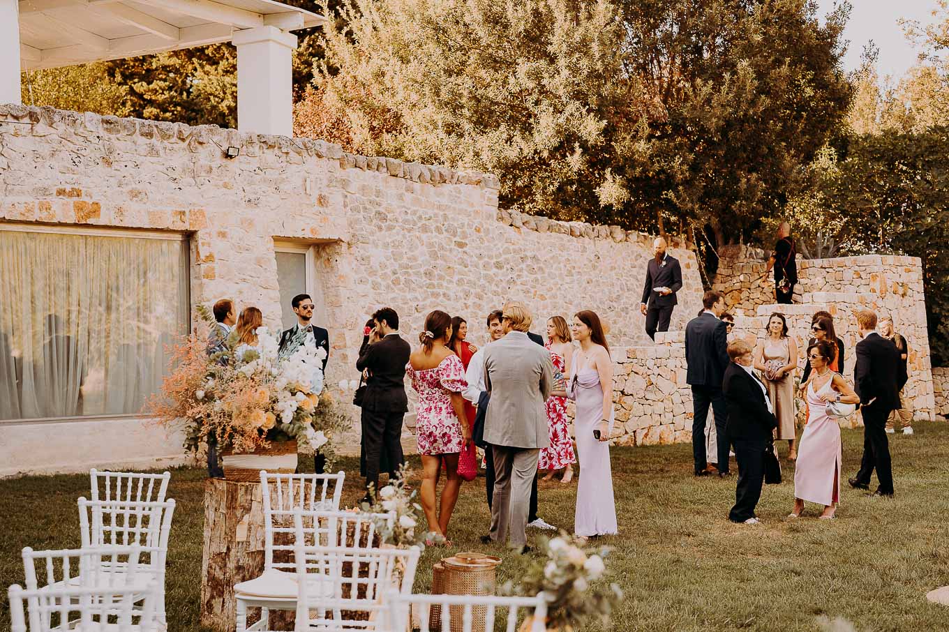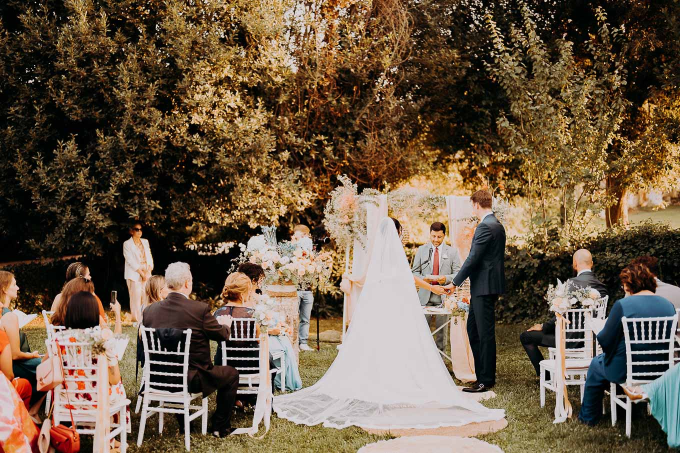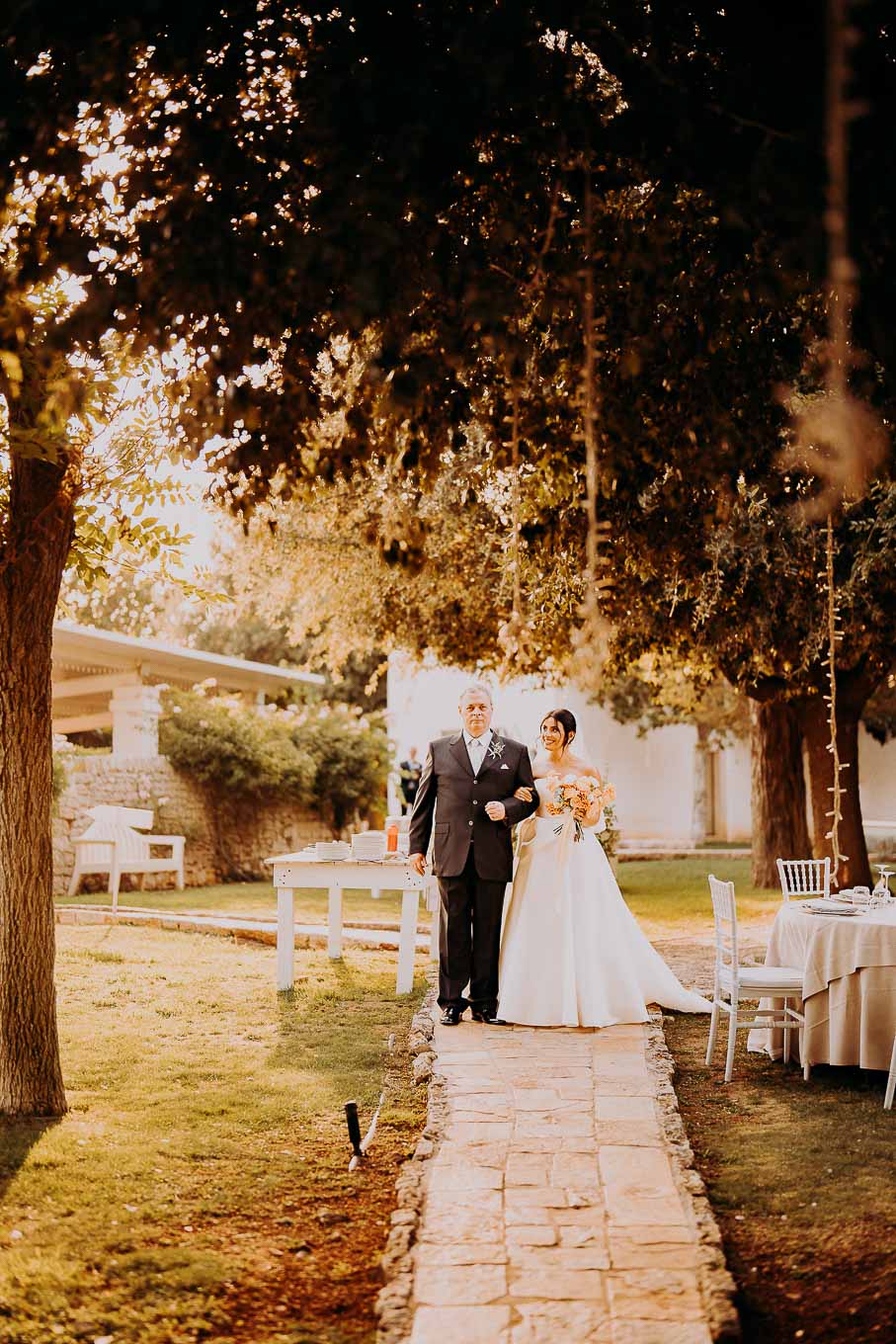 La cerimonia civile si è svolta all'esterno, su un prato verde punteggiato da alberi secolari. La luce calda del tramonto ha avvolto gli sposi e gli ospiti, creando un'atmosfera romantica e suggestiva. Il rito è stato celebrato con eleganza e semplicità, rispettando la tradizione pugliese e l'intimità del luogo.