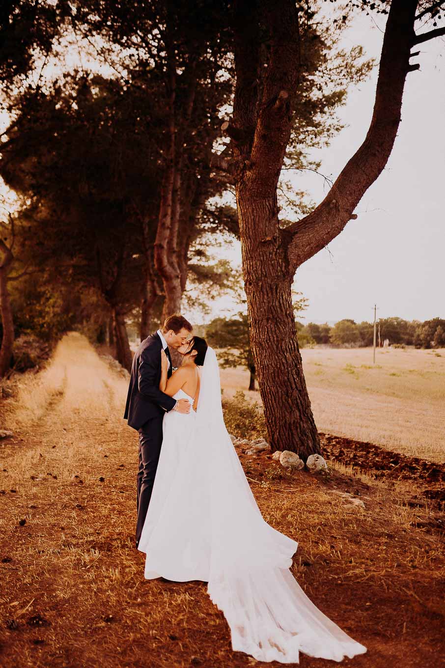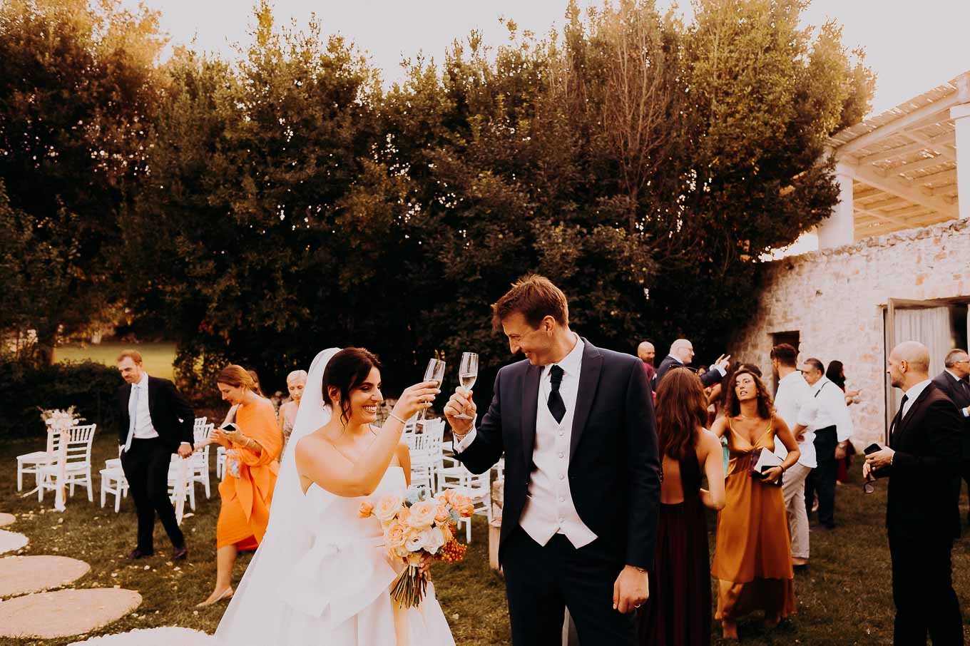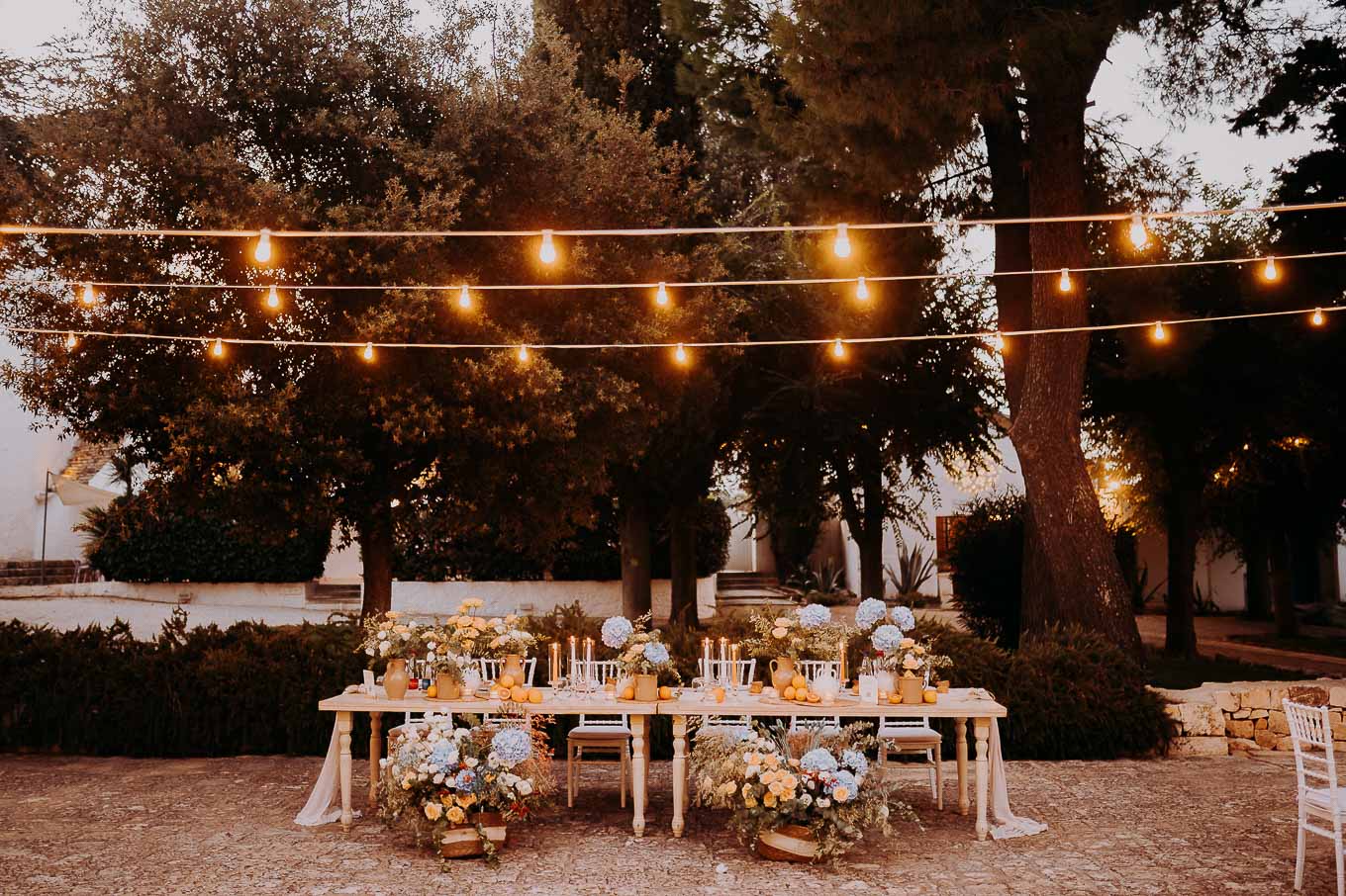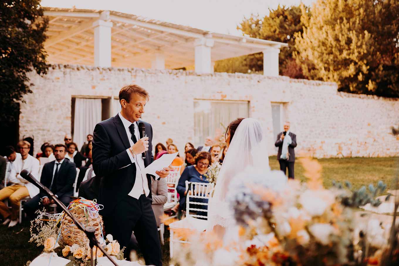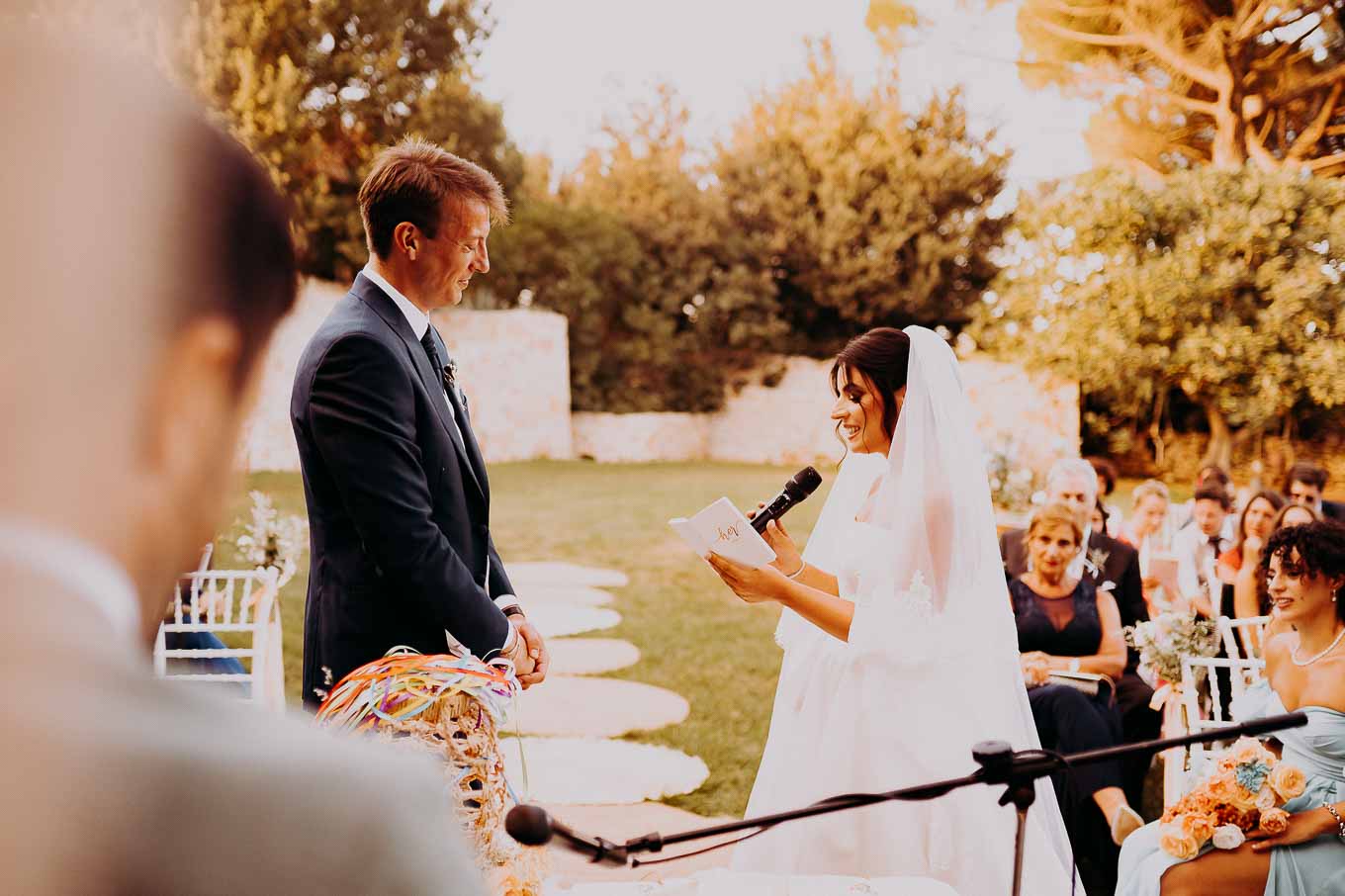La cerimonia civile si è svolta all'esterno, su un prato verde punteggiato da alberi secolari. La luce calda del tramonto ha avvolto gli sposi e gli ospiti, creando un'atmosfera romantica e suggestiva. Il rito è stato celebrato con eleganza e semplicità, rispettando la tradizione pugliese e l'intimità del luogo.