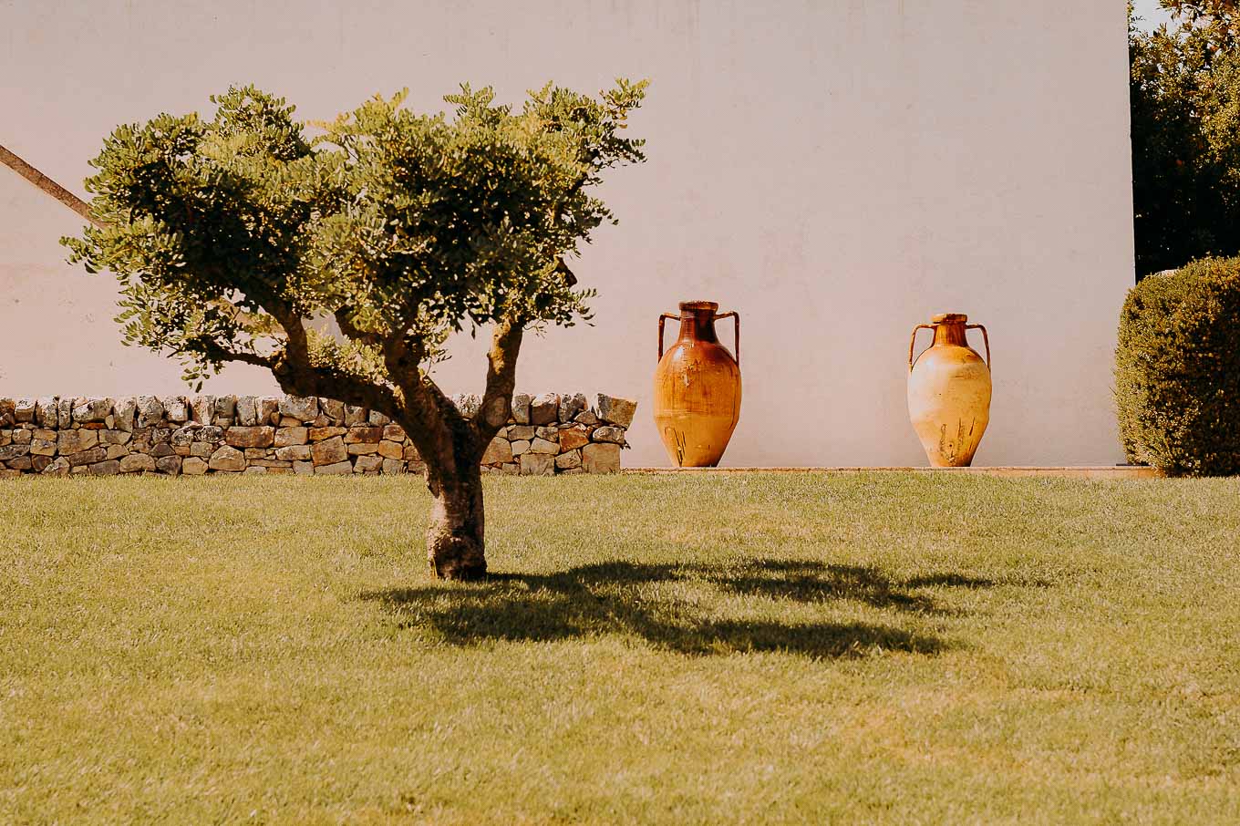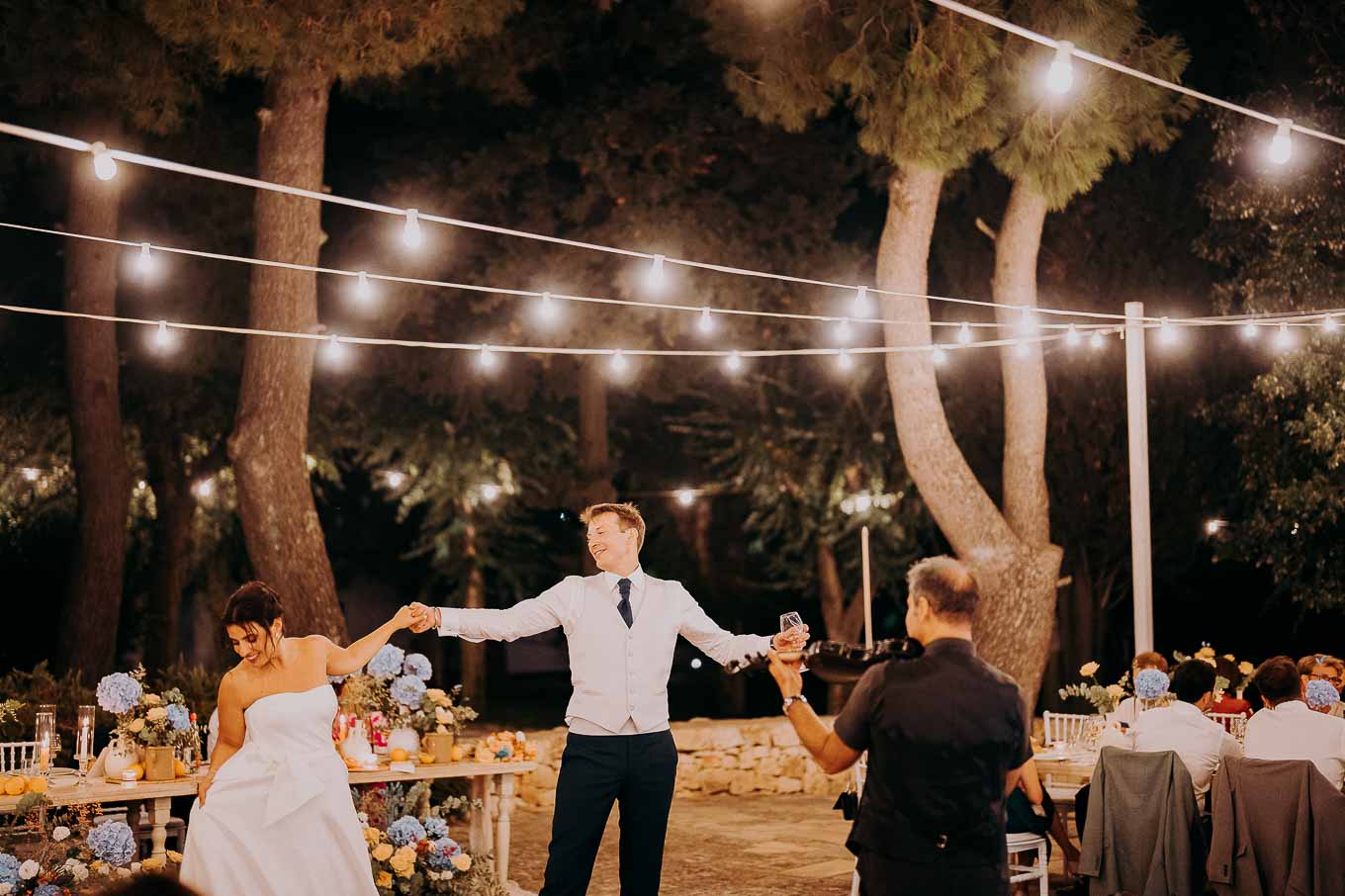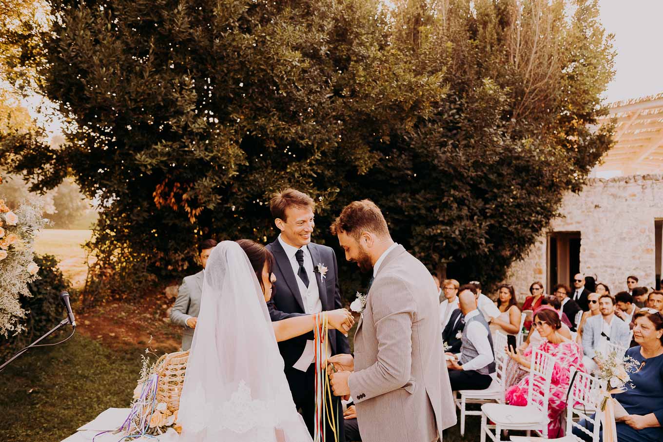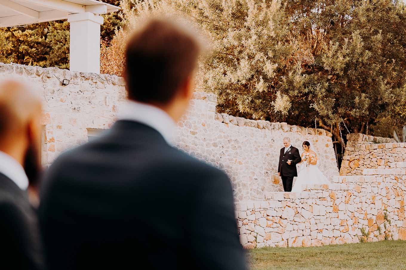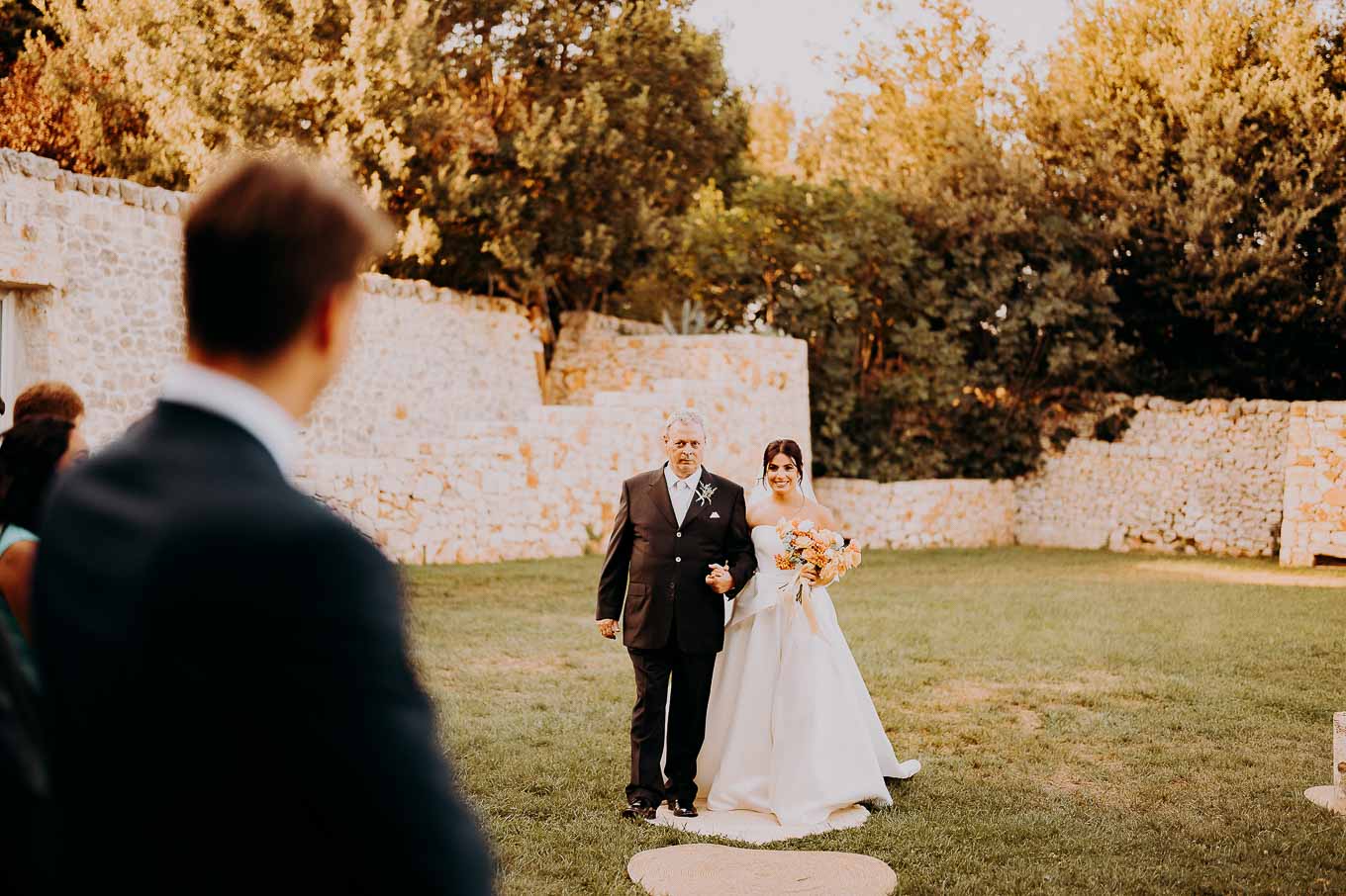 La cerimonia civile si è svolta all'esterno, su un prato verde punteggiato da alberi secolari. La luce calda del tramonto ha avvolto gli sposi e gli ospiti, creando un'atmosfera romantica e suggestiva. Il rito è stato celebrato con eleganza e semplicità, rispettando la tradizione pugliese e l'intimità del luogo.