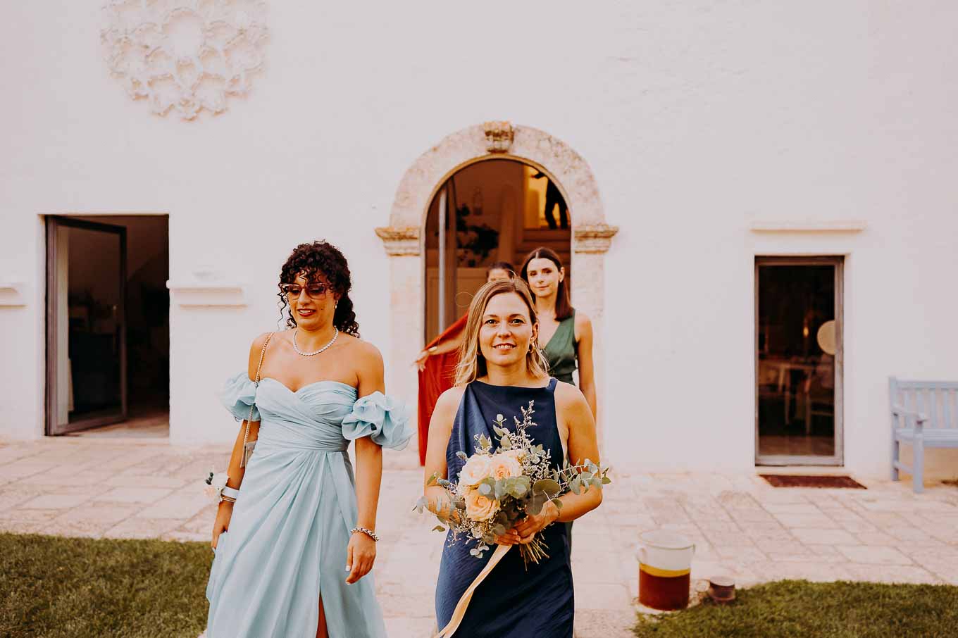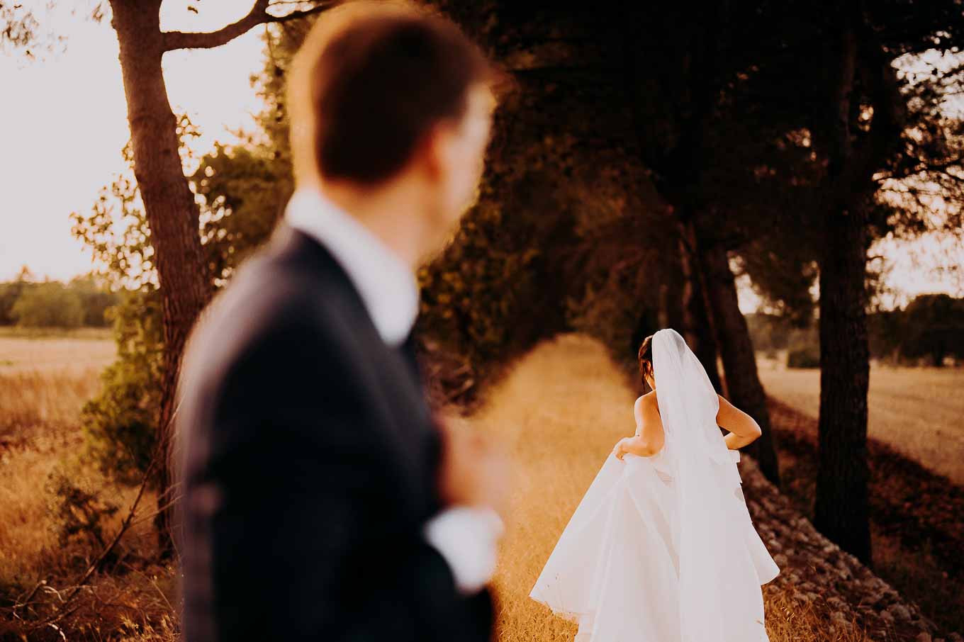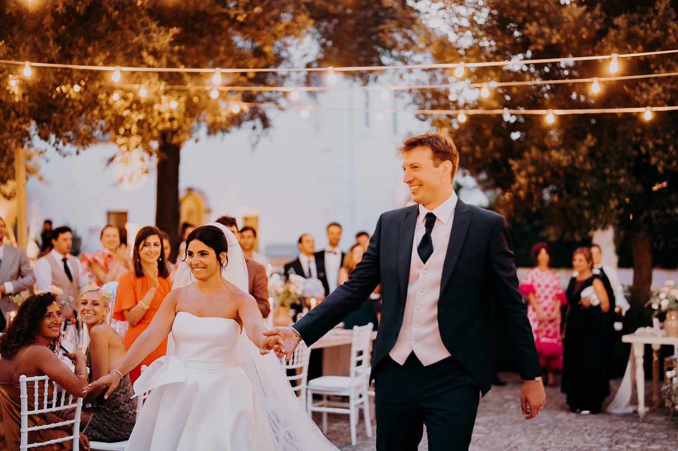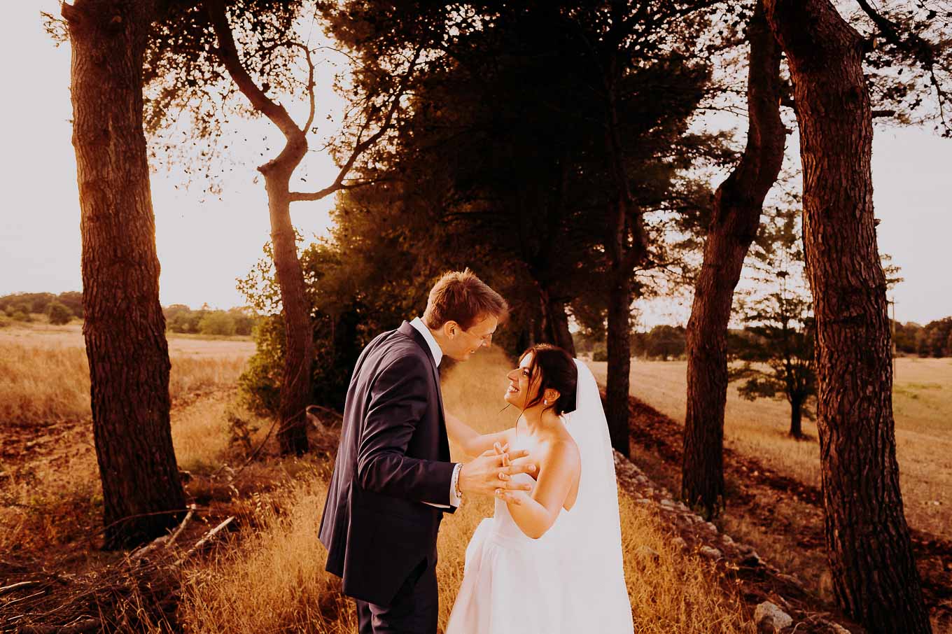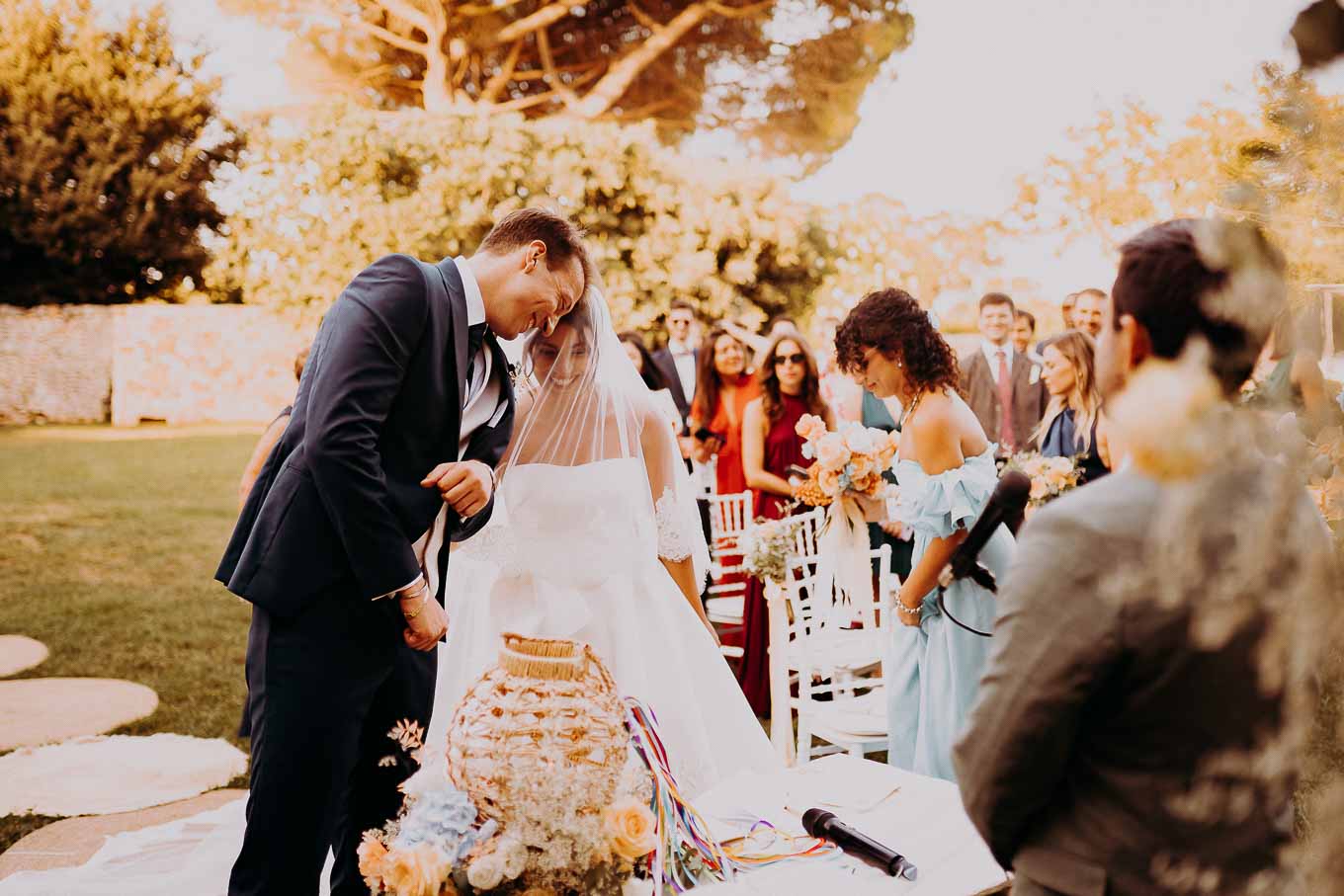 La cerimonia civile si è svolta all'esterno, su un prato verde punteggiato da alberi secolari. La luce calda del tramonto ha avvolto gli sposi e gli ospiti, creando un'atmosfera romantica e suggestiva. Il rito è stato celebrato con eleganza e semplicità, rispettando la tradizione pugliese e l'intimità del luogo.