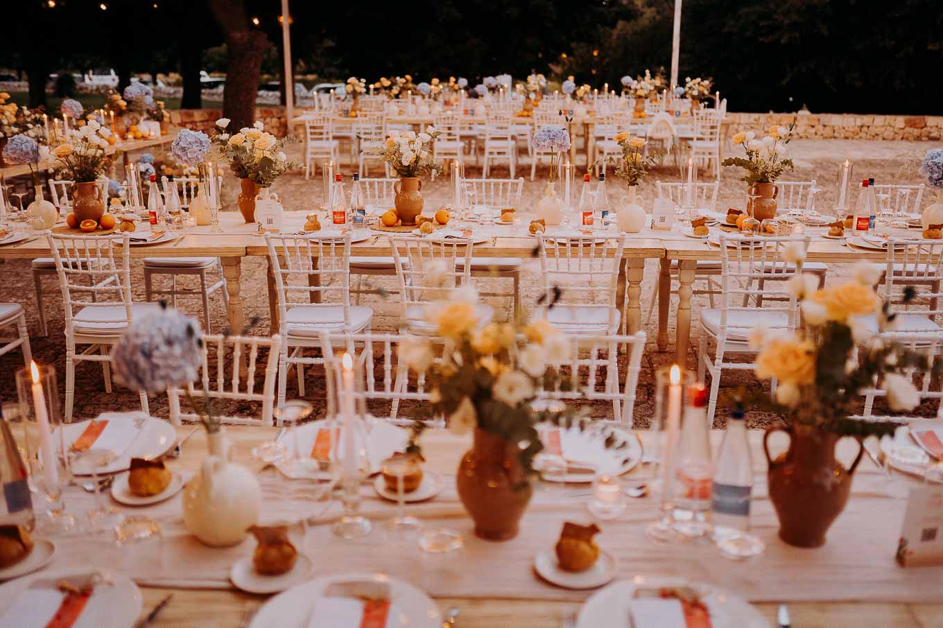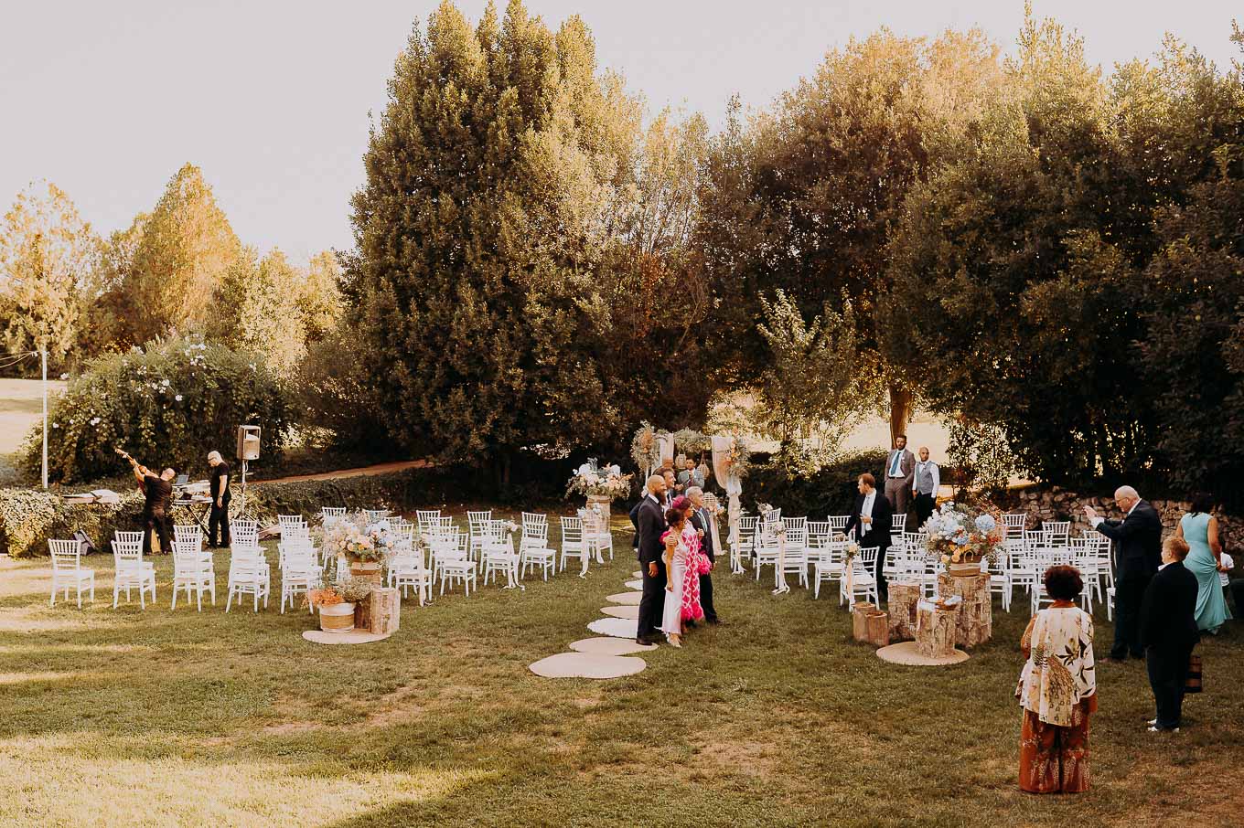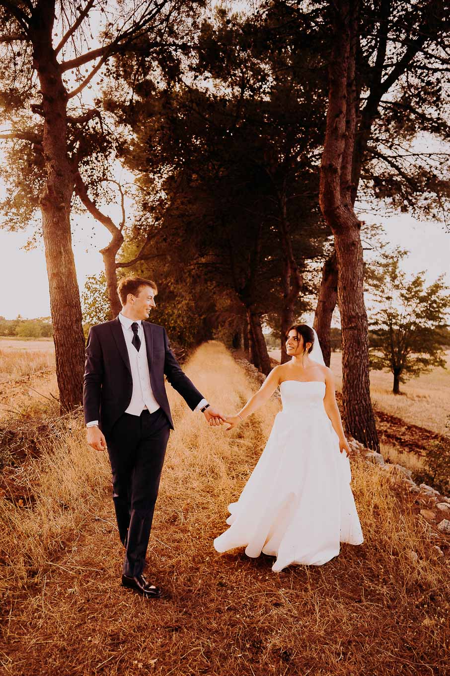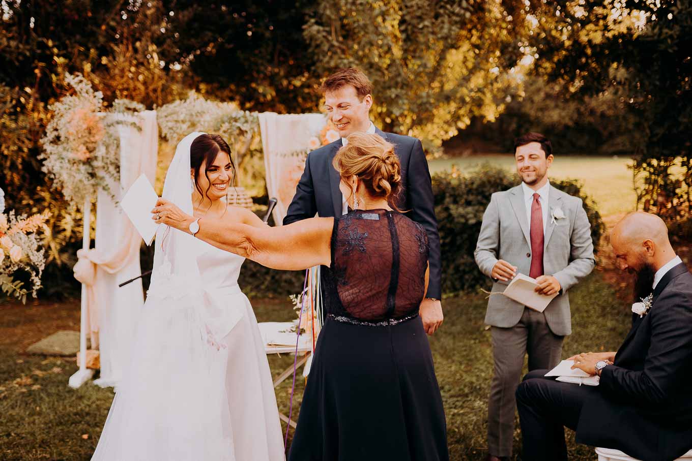 La cerimonia civile si è svolta all'esterno, su un prato verde punteggiato da alberi secolari. La luce calda del tramonto ha avvolto gli sposi e gli ospiti, creando un'atmosfera romantica e suggestiva. Il rito è stato celebrato con eleganza e semplicità, rispettando la tradizione pugliese e l'intimità del luogo.