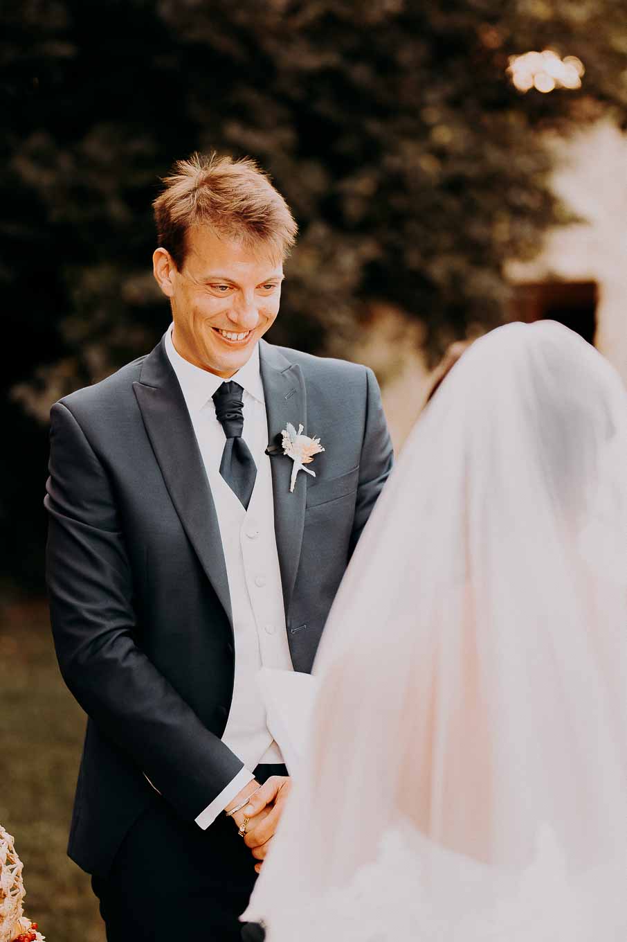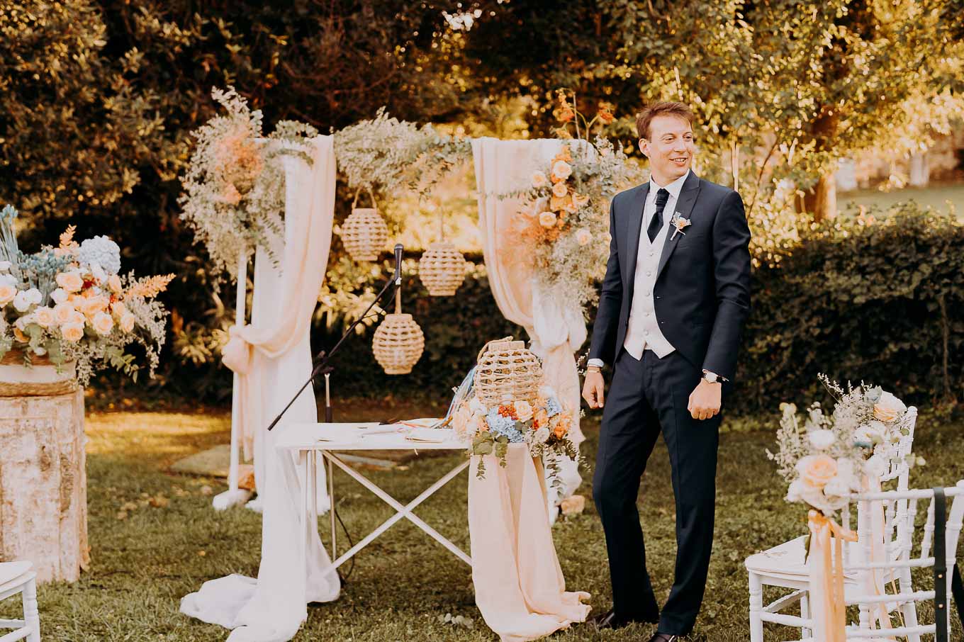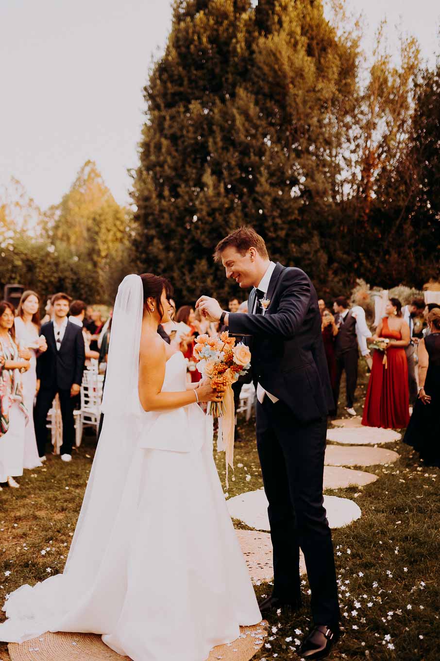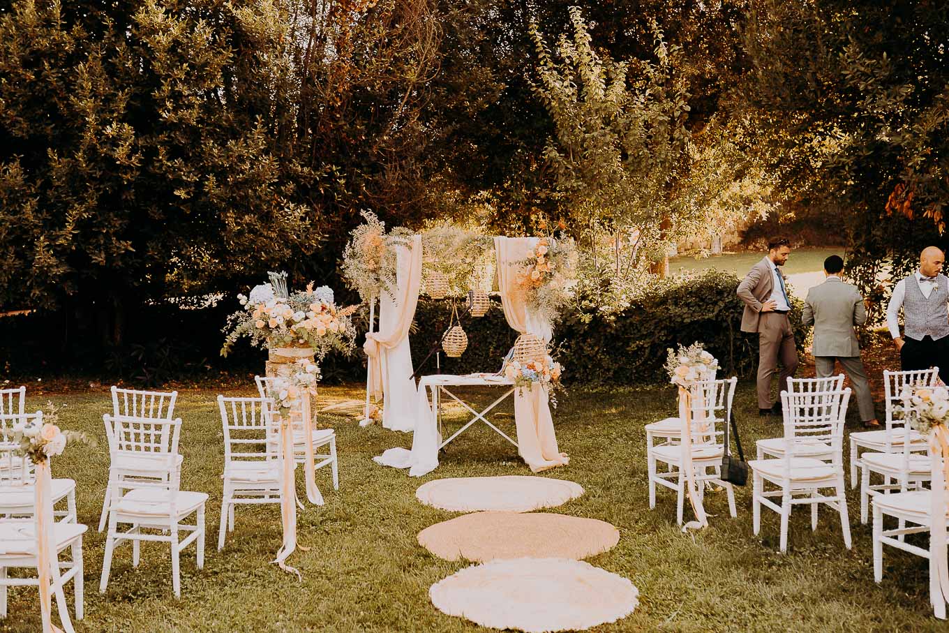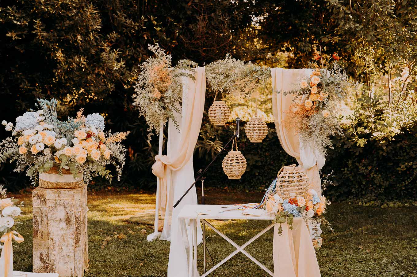 La cerimonia civile si è svolta all'esterno, su un prato verde punteggiato da alberi secolari. La luce calda del tramonto ha avvolto gli sposi e gli ospiti, creando un'atmosfera romantica e suggestiva. Il rito è stato celebrato con eleganza e semplicità, rispettando la tradizione pugliese e l'intimità del luogo.