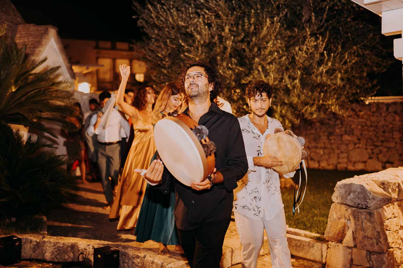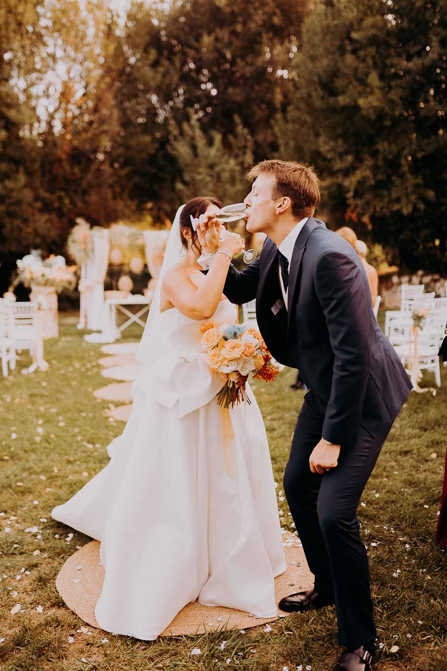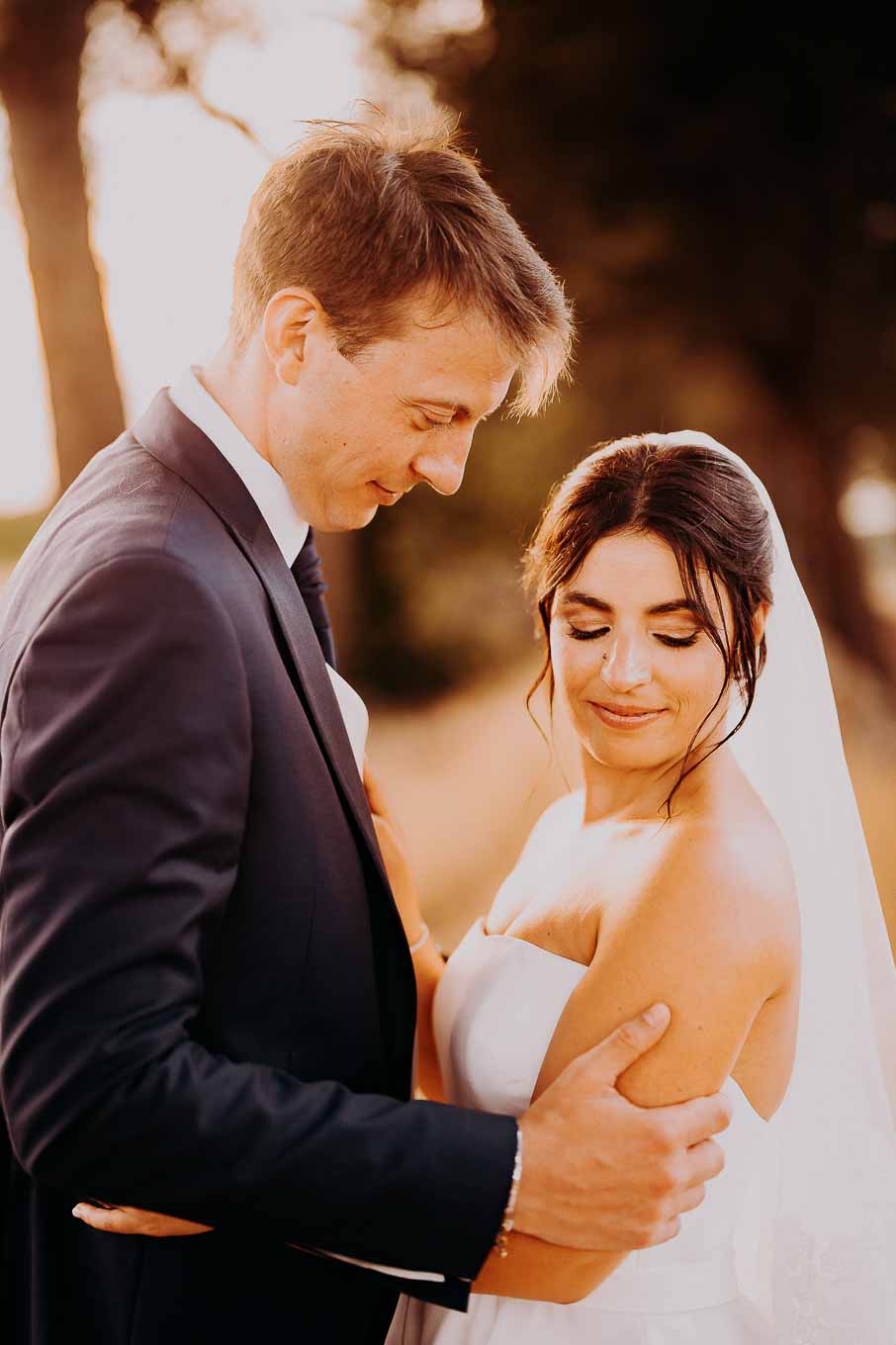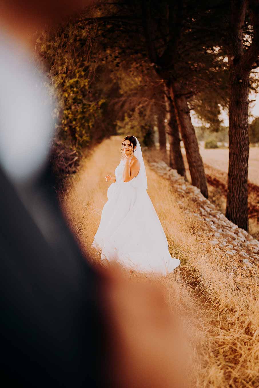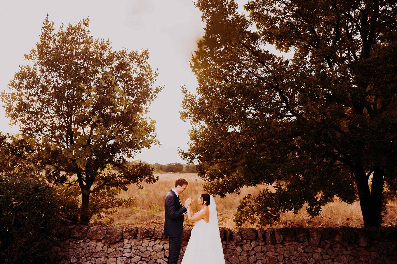 La cerimonia civile si è svolta all'esterno, su un prato verde punteggiato da alberi secolari. La luce calda del tramonto ha avvolto gli sposi e gli ospiti, creando un'atmosfera romantica e suggestiva. Il rito è stato celebrato con eleganza e semplicità, rispettando la tradizione pugliese e l'intimità del luogo.