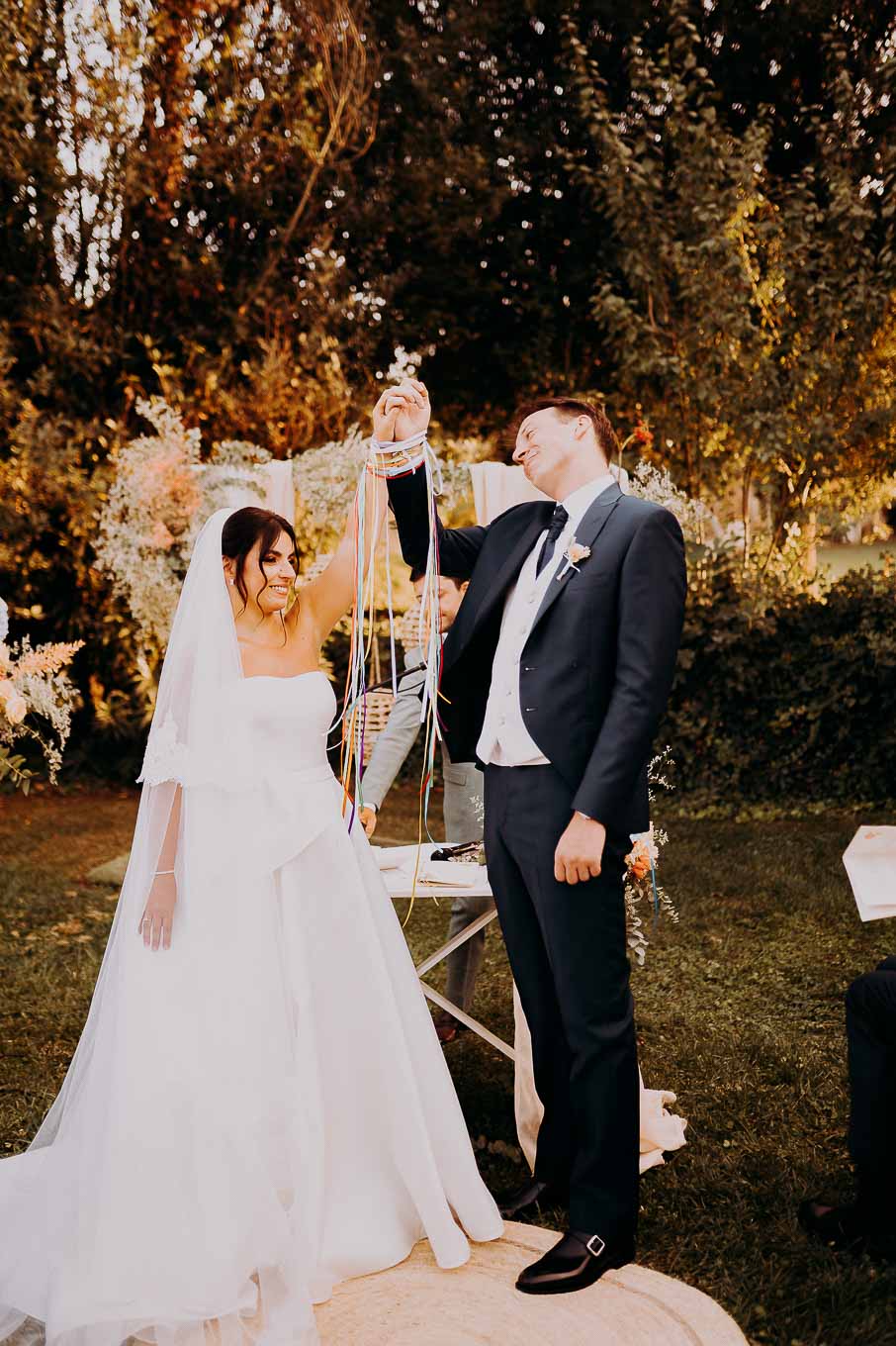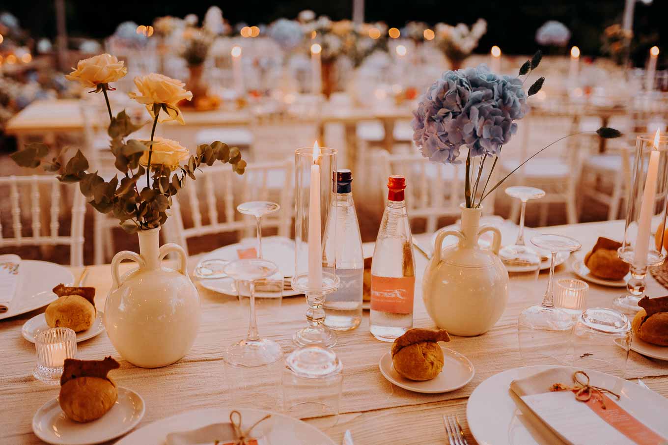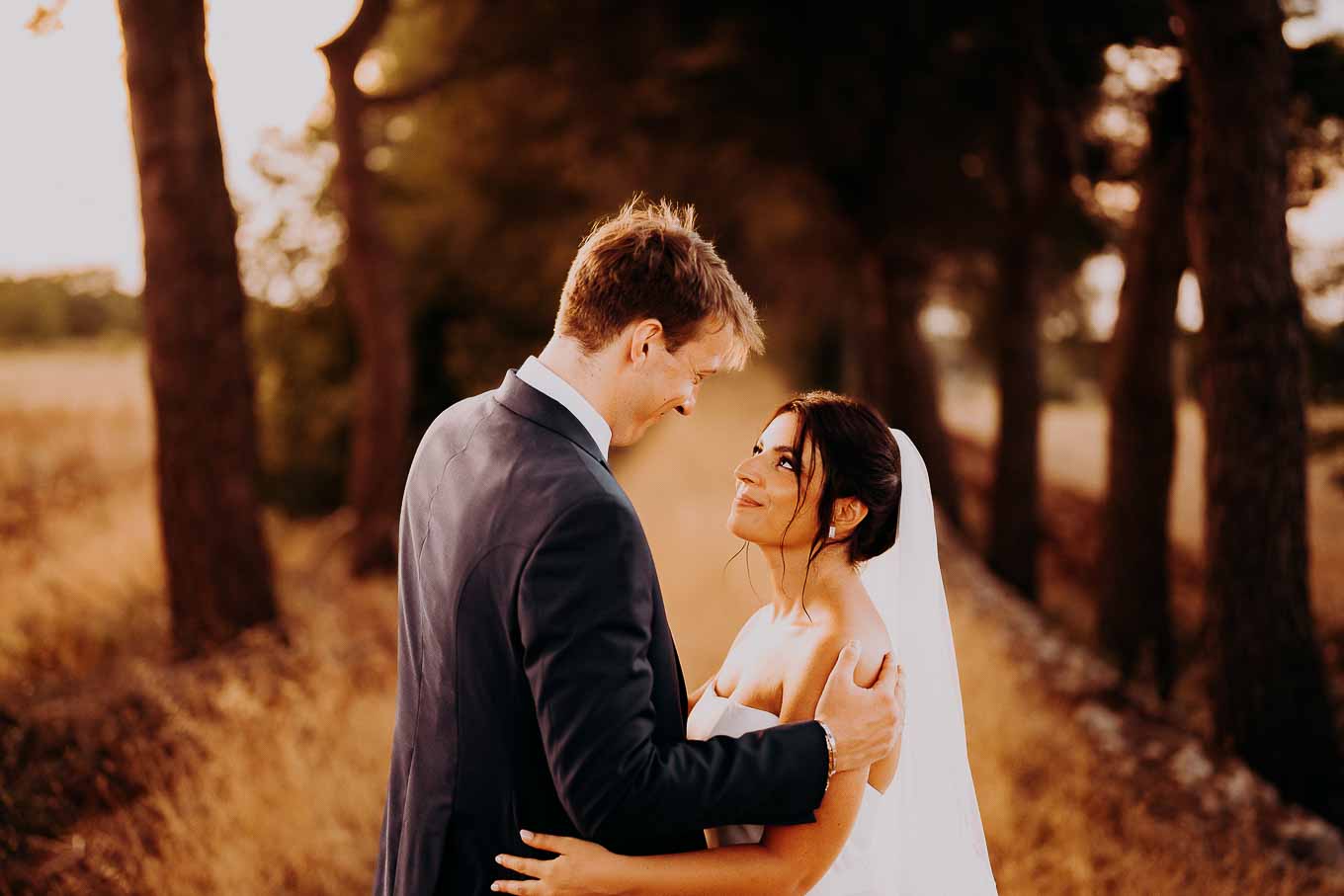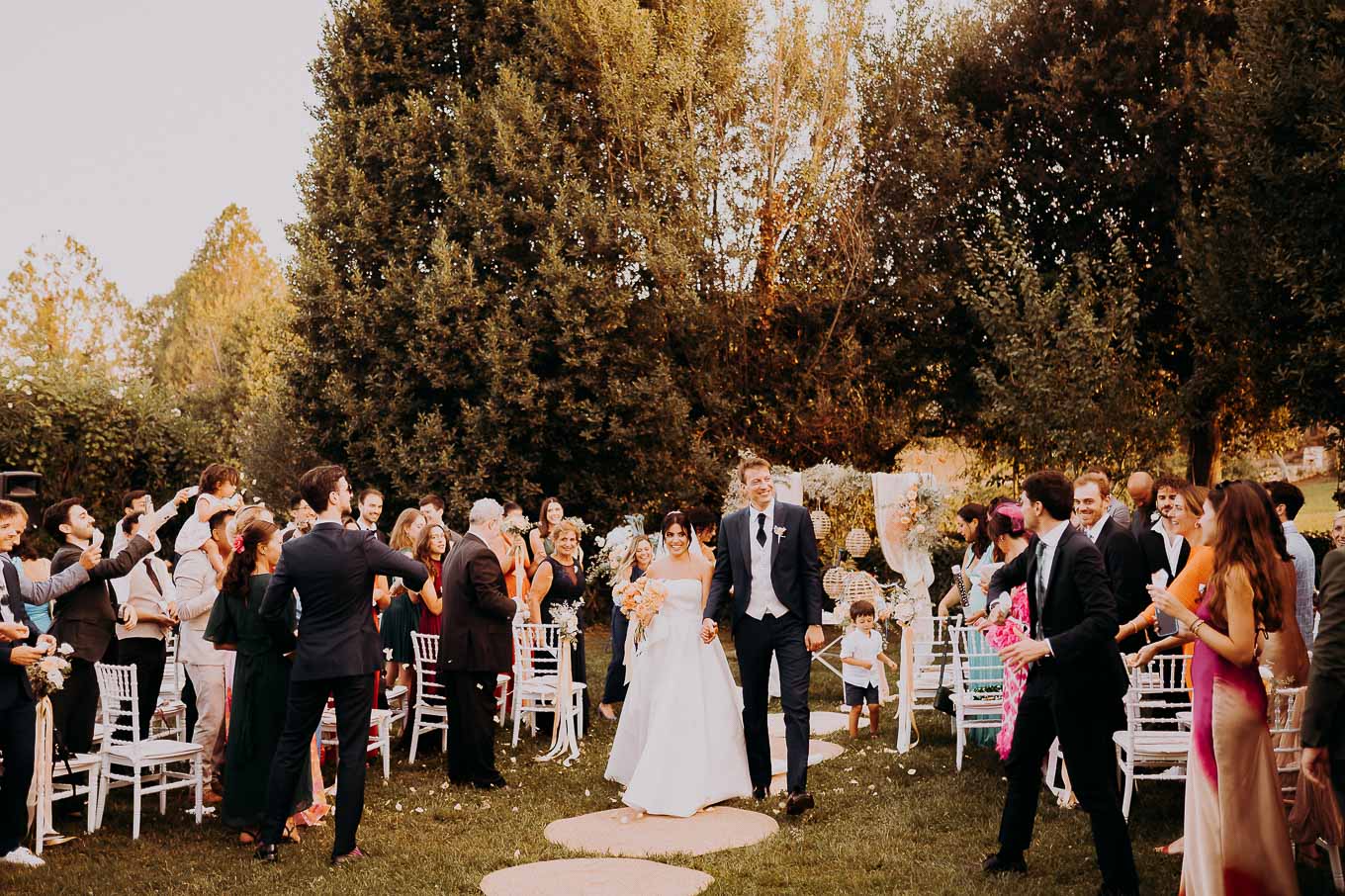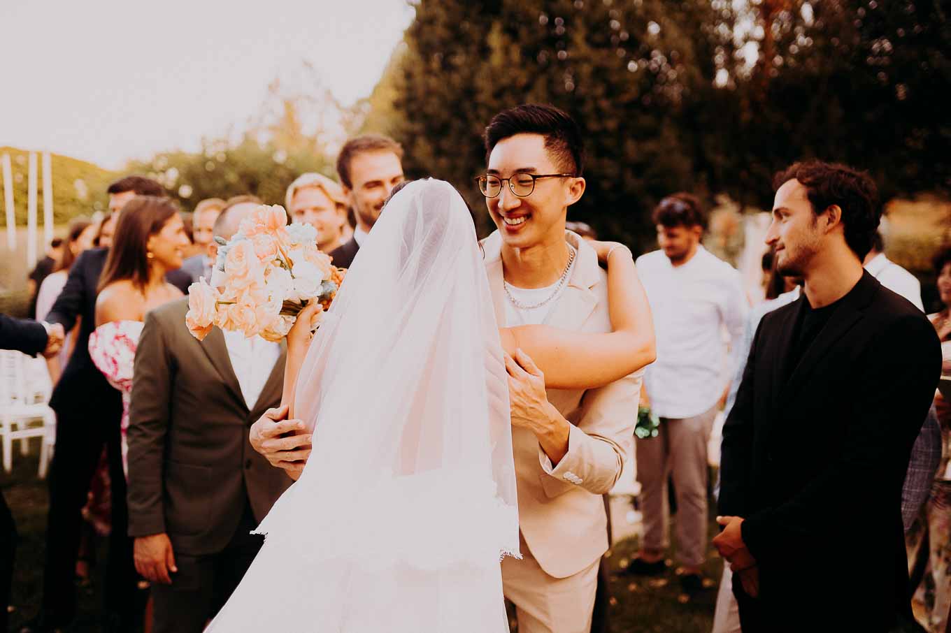 La cerimonia civile si è svolta all'esterno, su un prato verde punteggiato da alberi secolari. La luce calda del tramonto ha avvolto gli sposi e gli ospiti, creando un'atmosfera romantica e suggestiva. Il rito è stato celebrato con eleganza e semplicità, rispettando la tradizione pugliese e l'intimità del luogo.