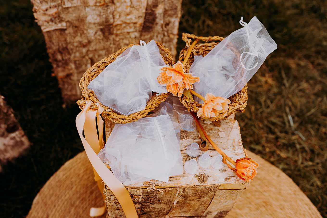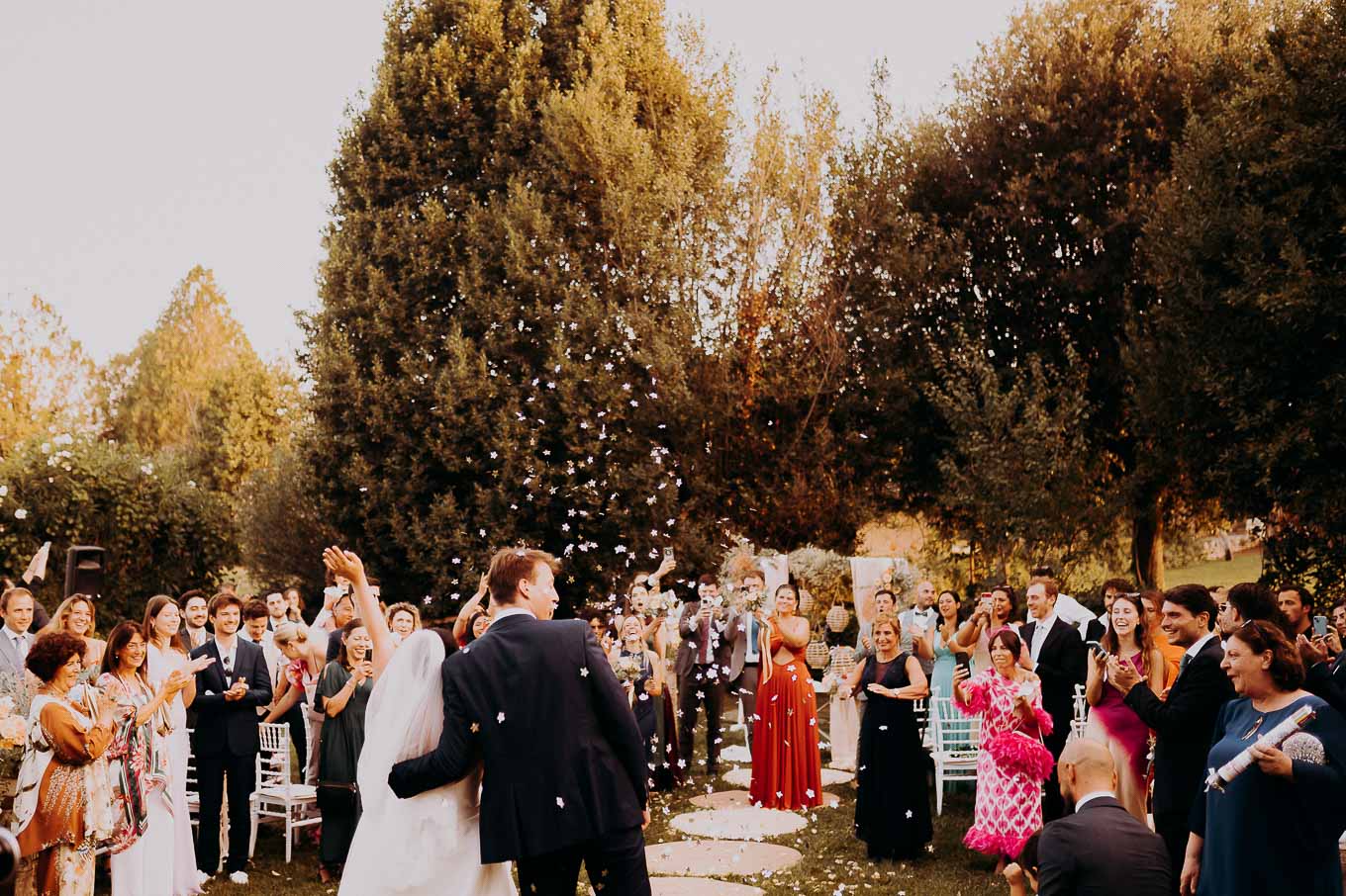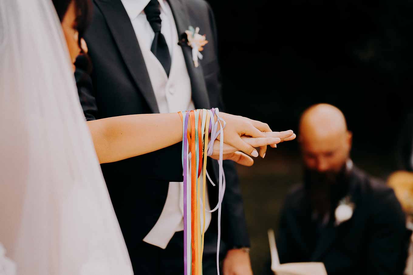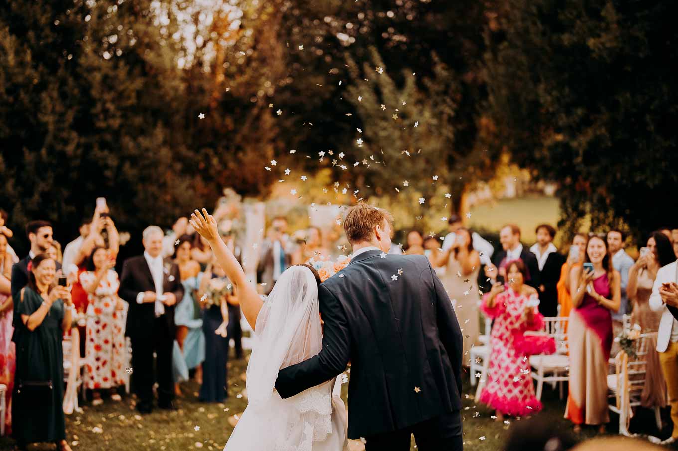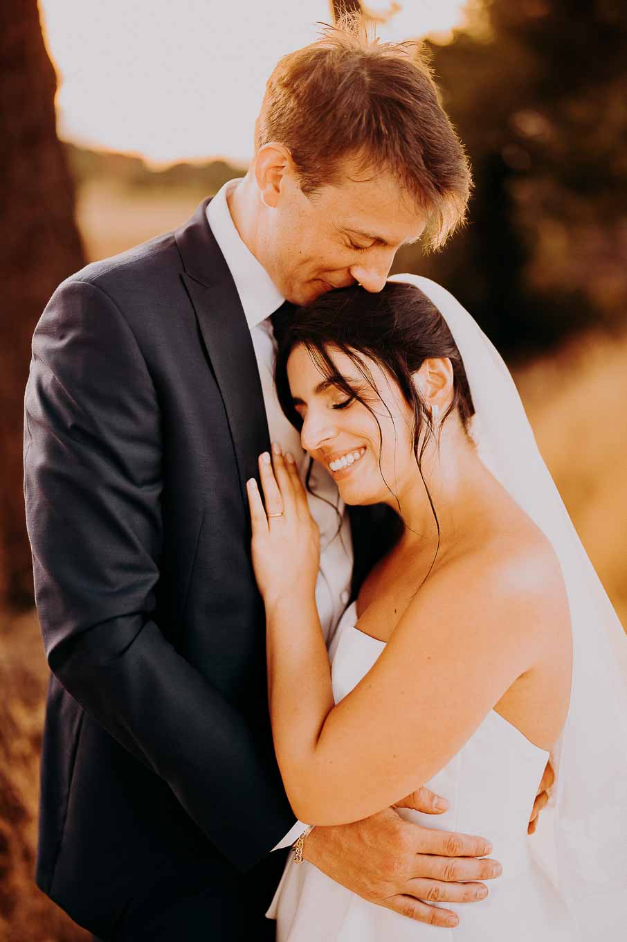 La cerimonia civile si è svolta all'esterno, su un prato verde punteggiato da alberi secolari. La luce calda del tramonto ha avvolto gli sposi e gli ospiti, creando un'atmosfera romantica e suggestiva. Il rito è stato celebrato con eleganza e semplicità, rispettando la tradizione pugliese e l'intimità del luogo.