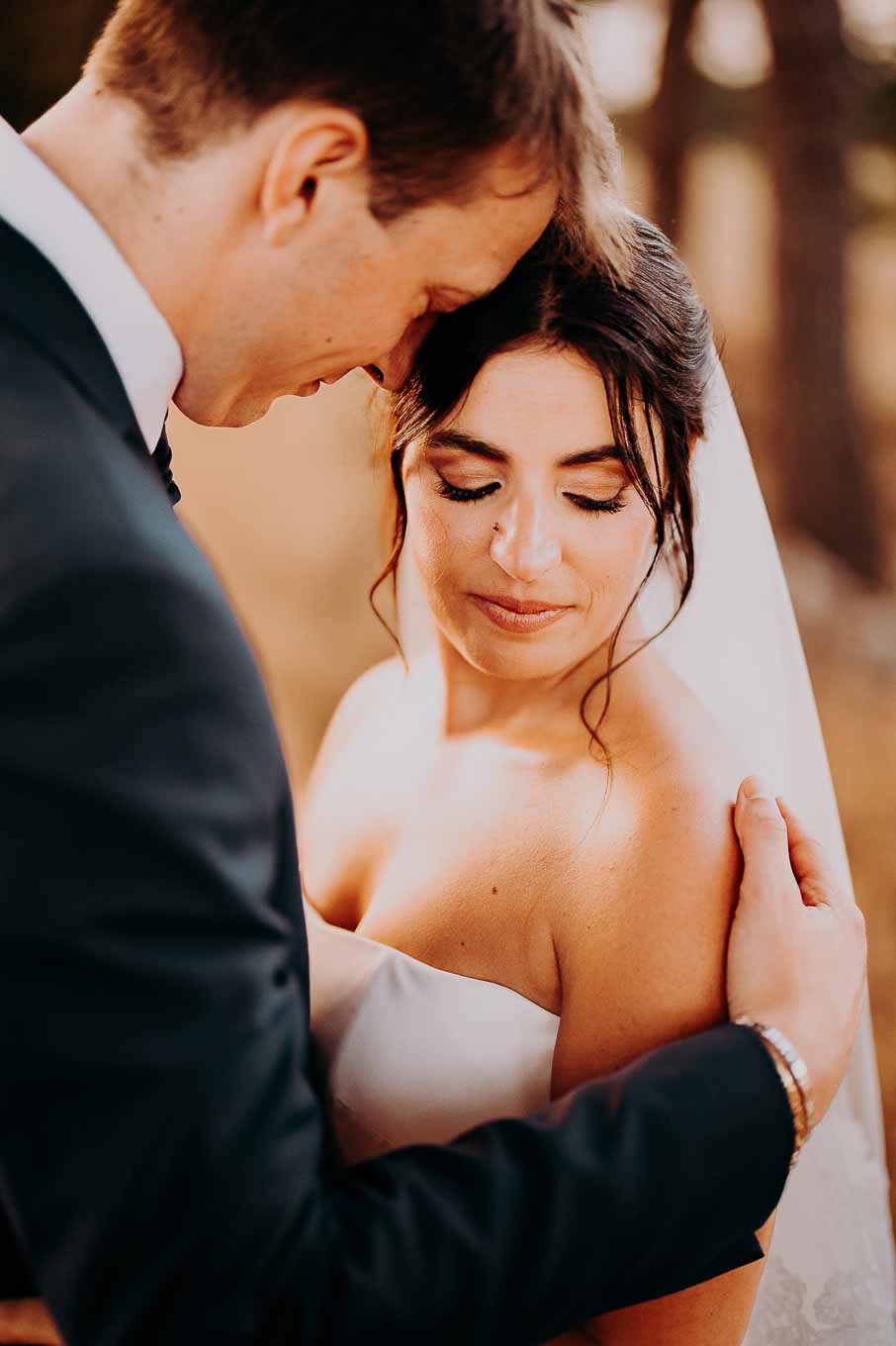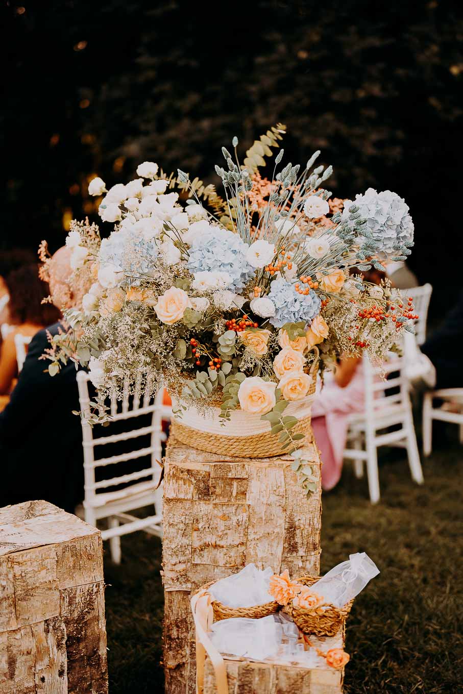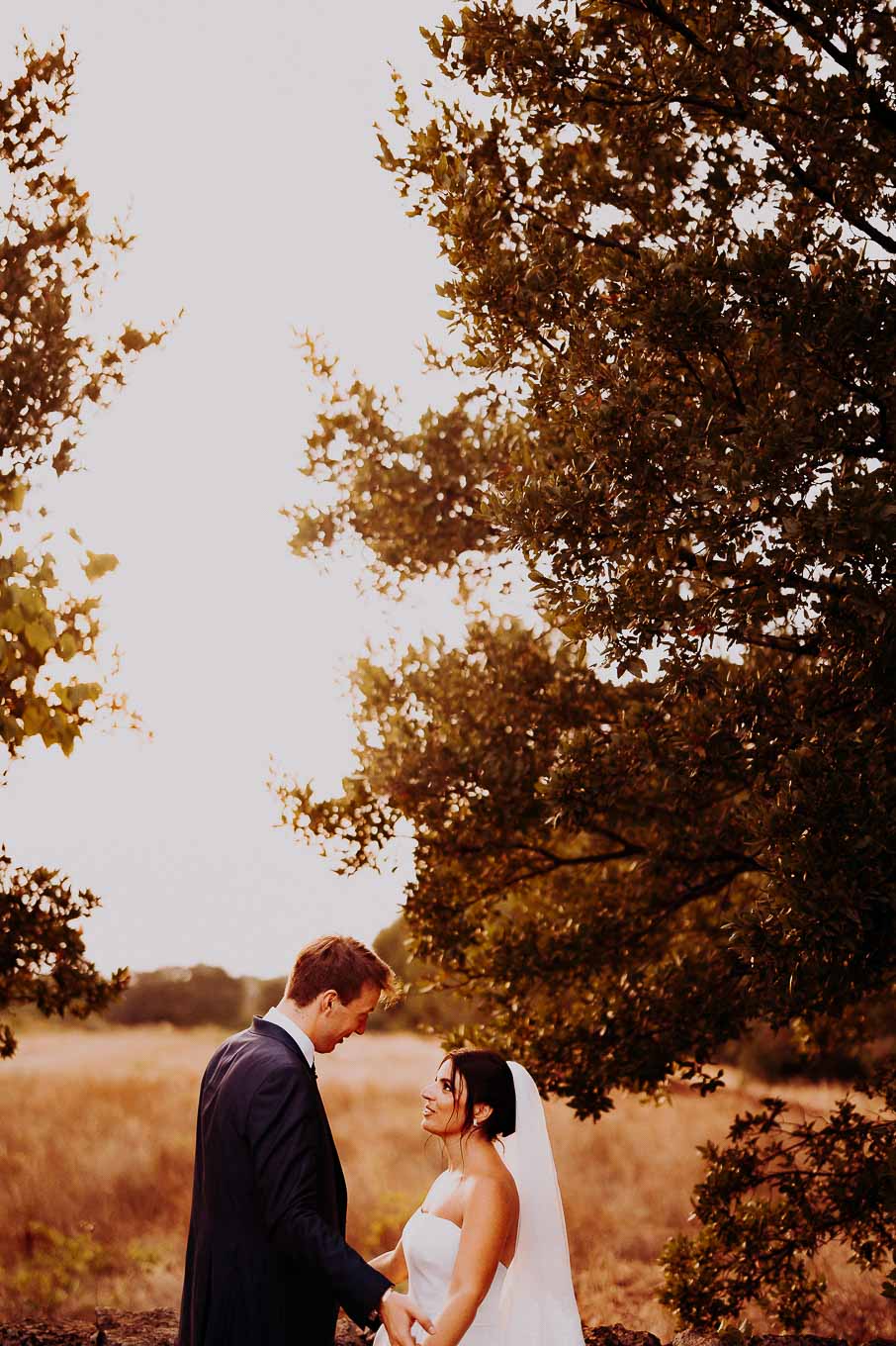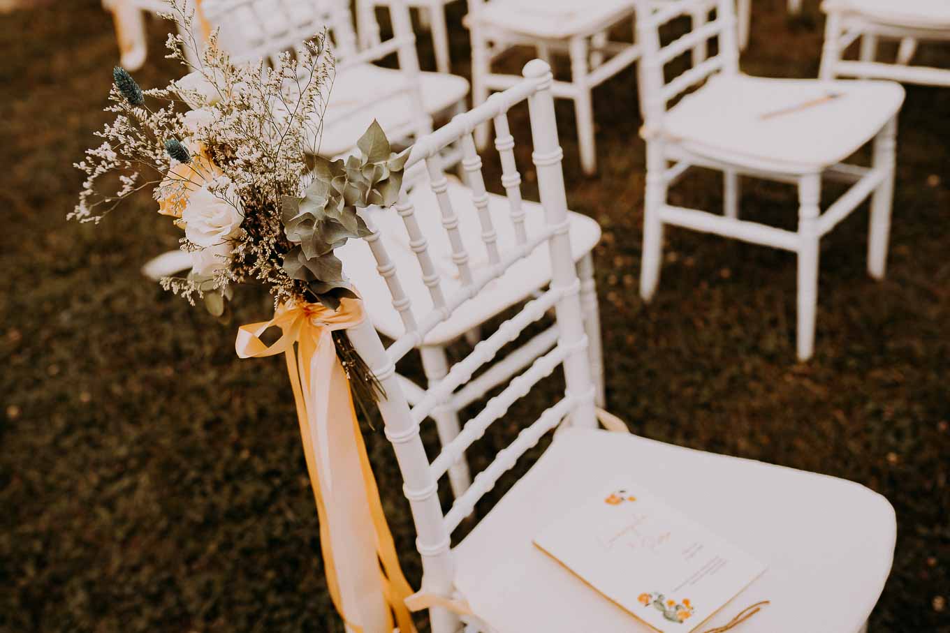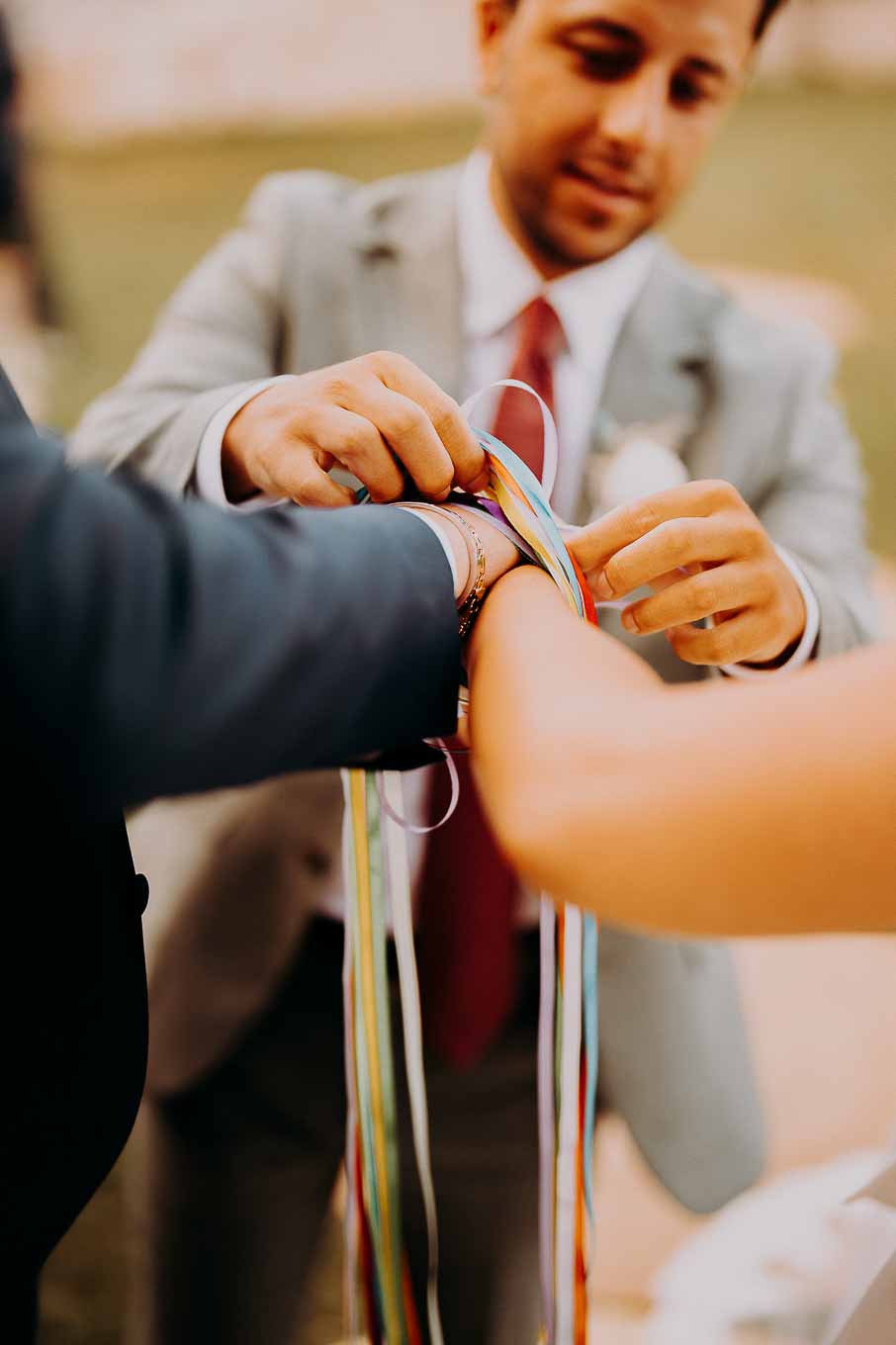 La cerimonia civile si è svolta all'esterno, su un prato verde punteggiato da alberi secolari. La luce calda del tramonto ha avvolto gli sposi e gli ospiti, creando un'atmosfera romantica e suggestiva. Il rito è stato celebrato con eleganza e semplicità, rispettando la tradizione pugliese e l'intimità del luogo.