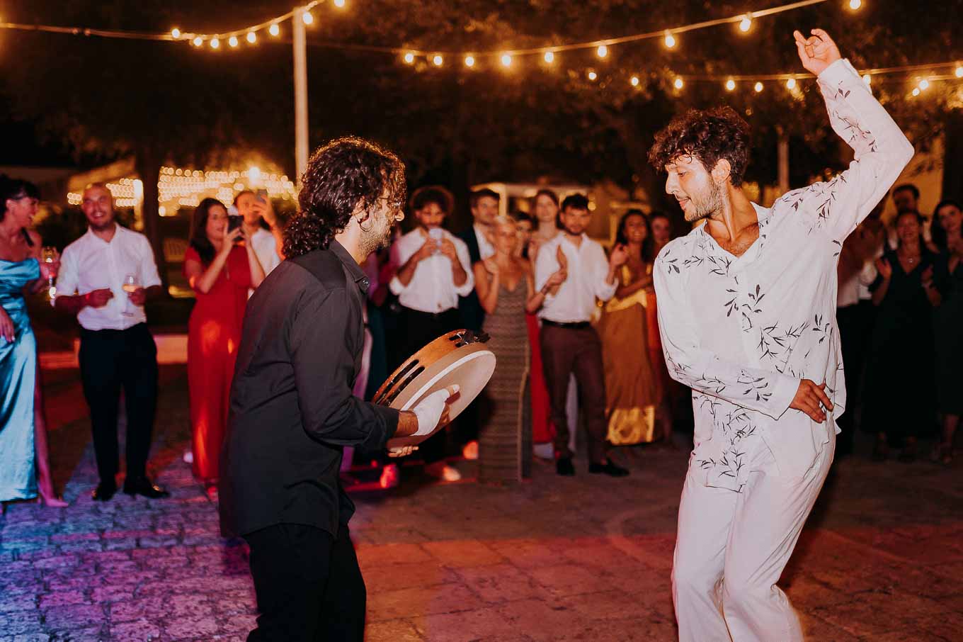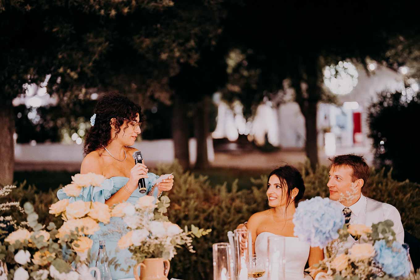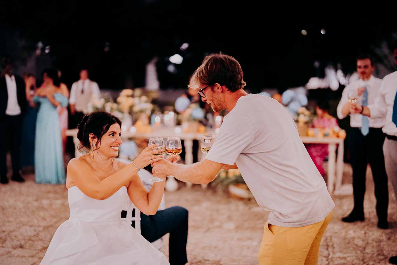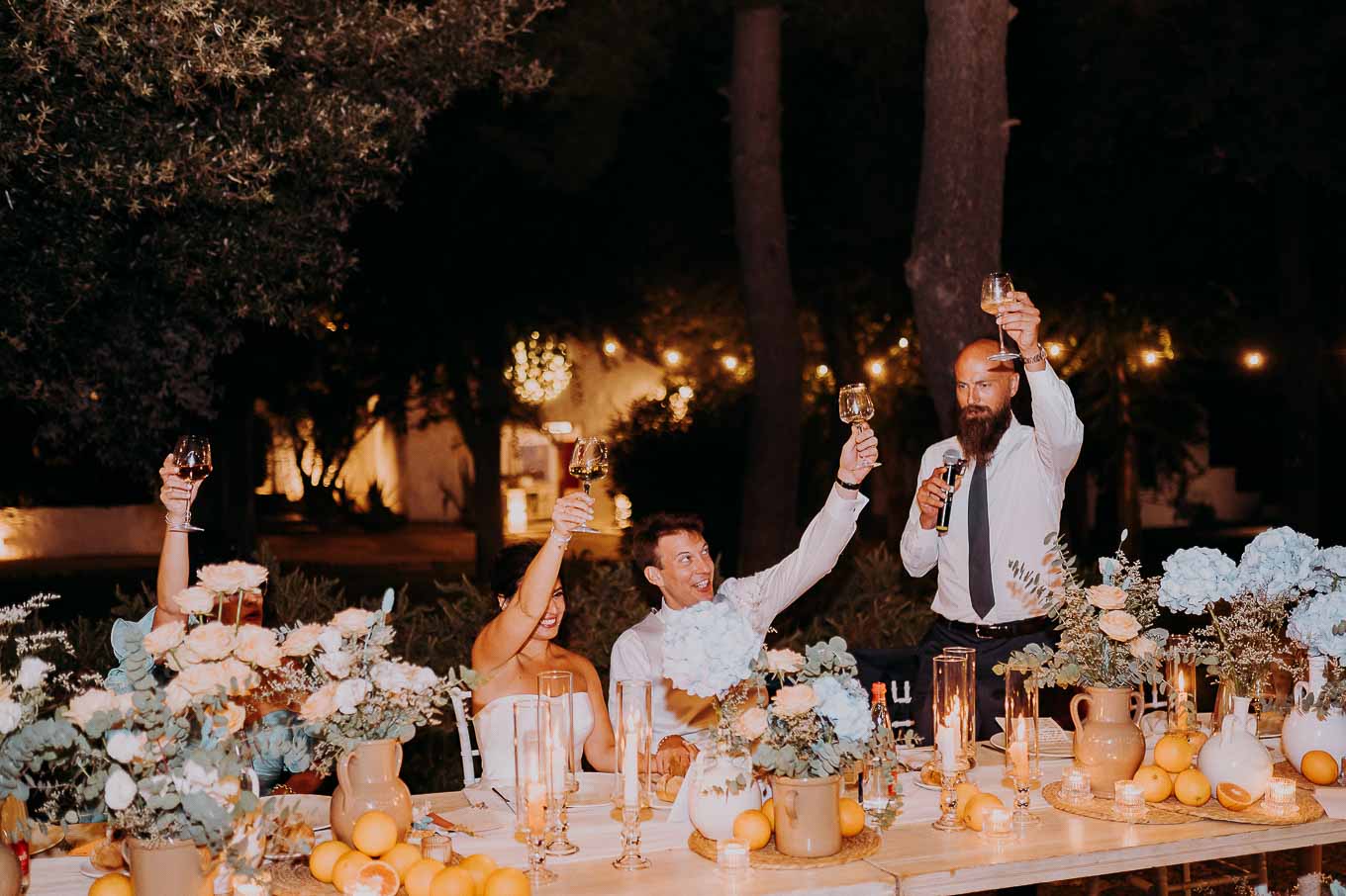 Dopo la cena, la festa è continuata con musica, balli e discorsi emozionanti. Gli amici degli sposi si sono scatenati sulla pista da ballo, creando un clima di allegria e spensieratezza. La serata si è conclusa con un brindisi sotto le stelle, celebrando l'amore e l'amicizia in un contesto unico e suggestivo.
