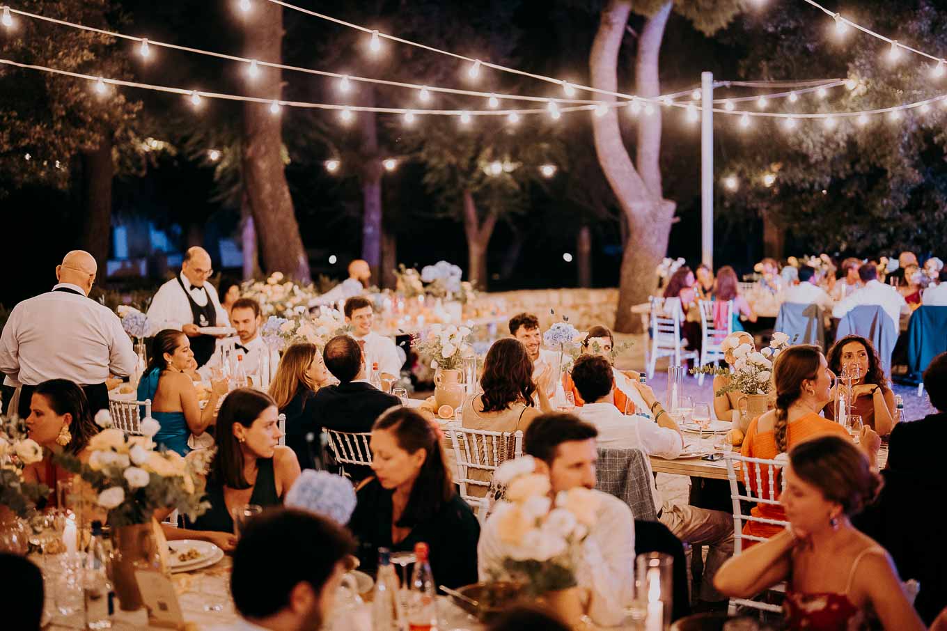 La cena si è svolta all'aperto, sotto un cielo stellato, con tavoli elegantemente apparecchiati e illuminati da lucine soffuse. L'atmosfera era magica e intima, con piatti tipici della cucina pugliese preparati con ingredienti freschi e locali. Gli ospiti hanno apprezzato la qualità del servizio e la bellezza del luogo, creando ricordi indelebili.