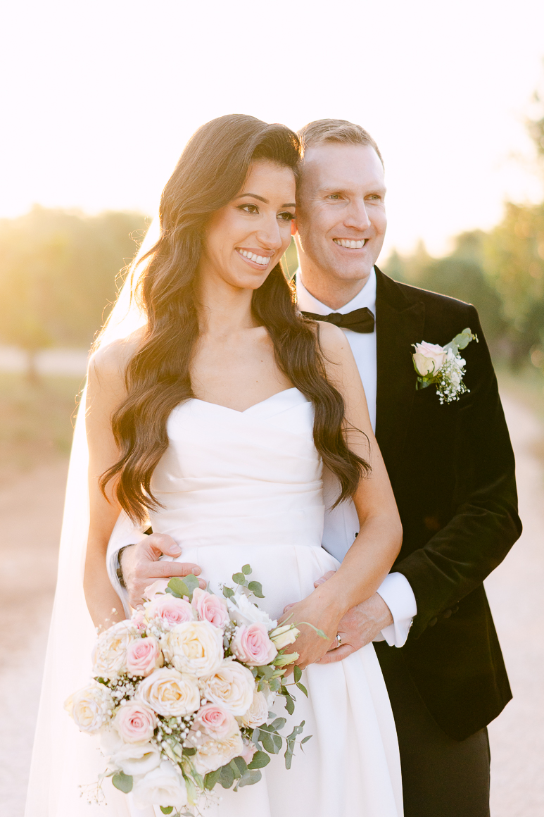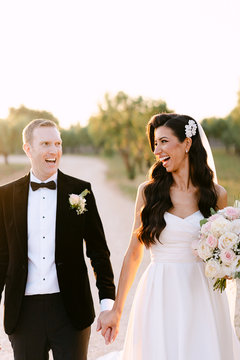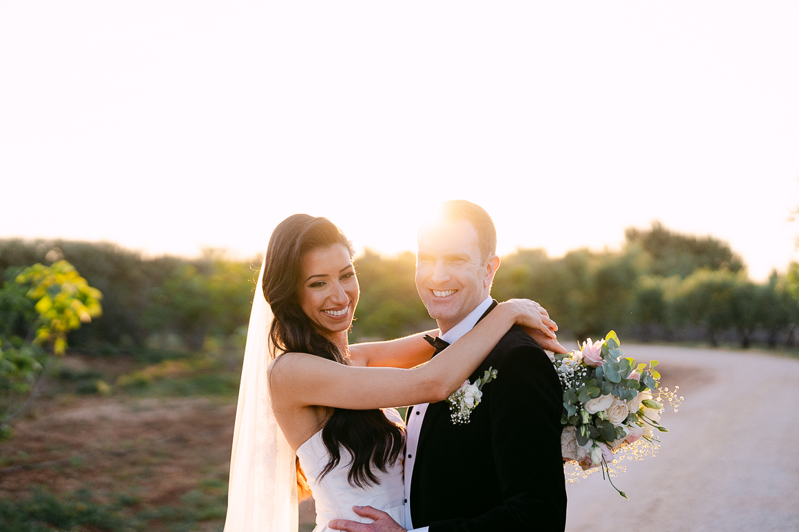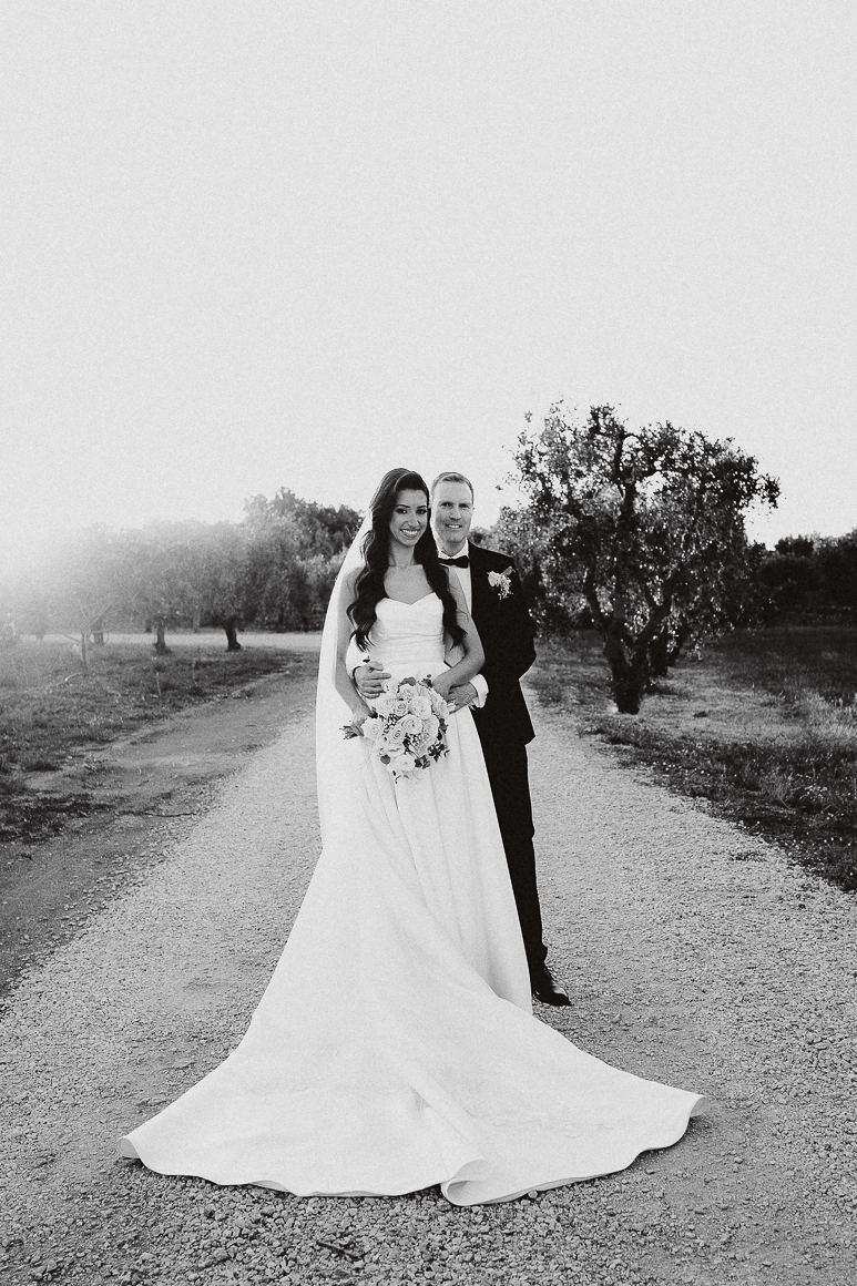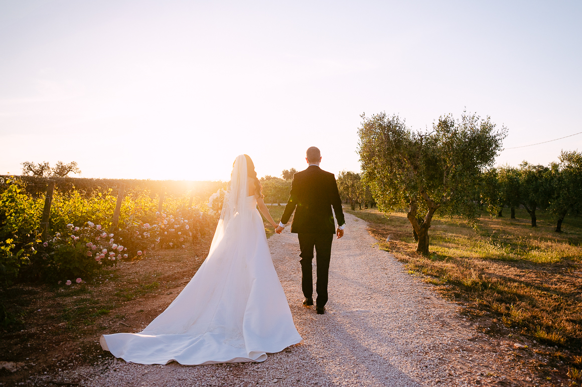 Dopo la cerimonia, ci siamo concessi qualche momento per immortalare la loro complicità tra gli ulivi e i sentieri in pietra della Masseria. Abbiamo alternato scatti spontanei di ispirazione reportagistica a immagini più curate in stile editoriale, lasciando che la luce calda del tramonto avvolgesse ogni dettaglio.