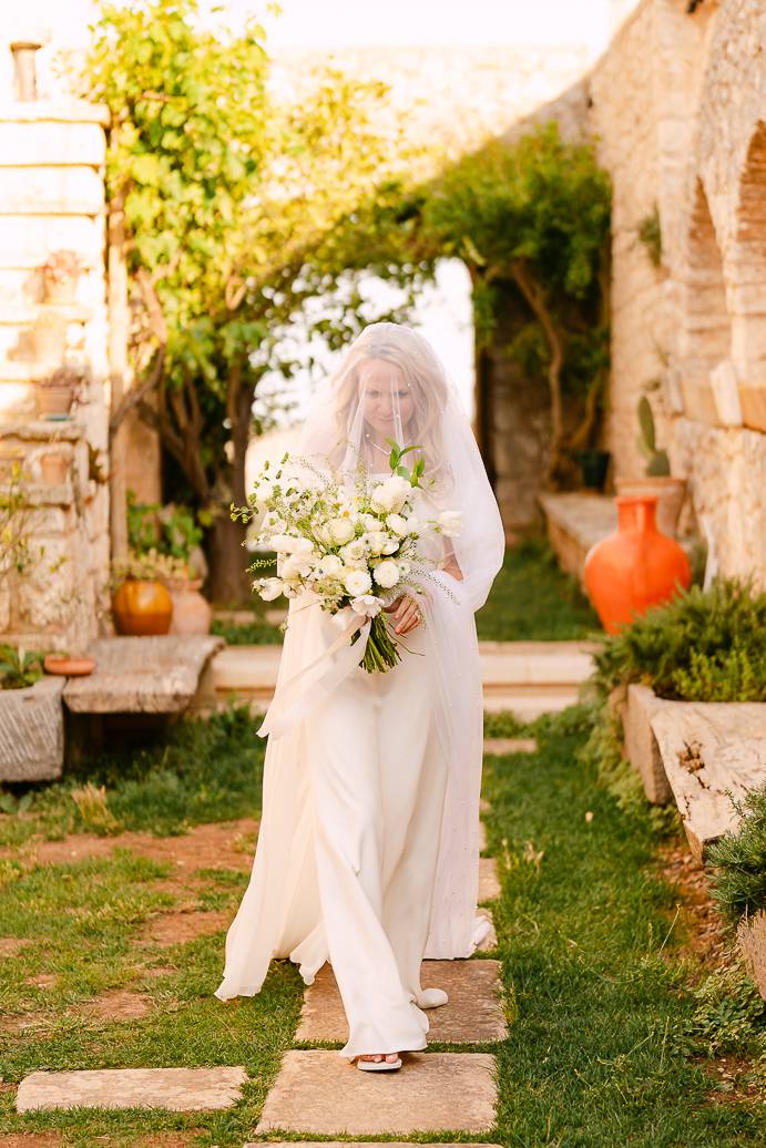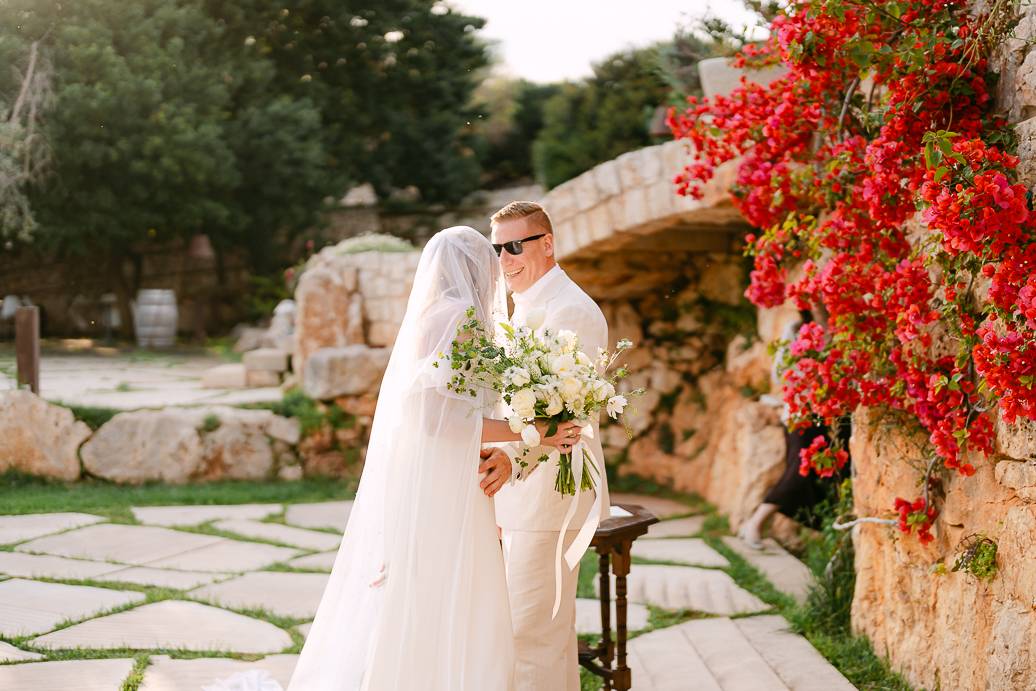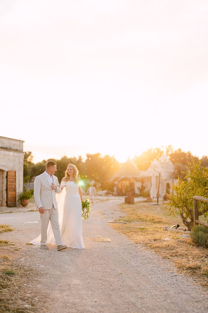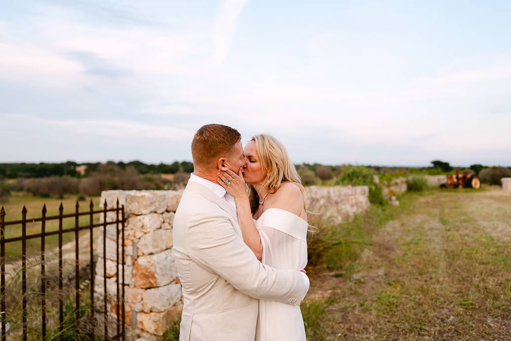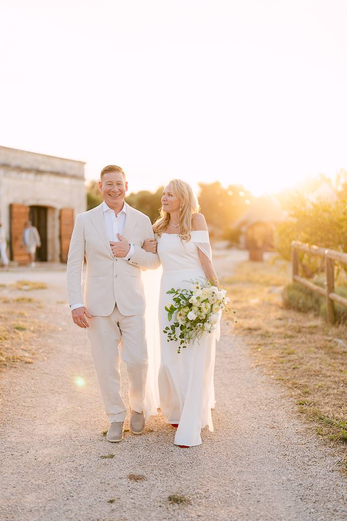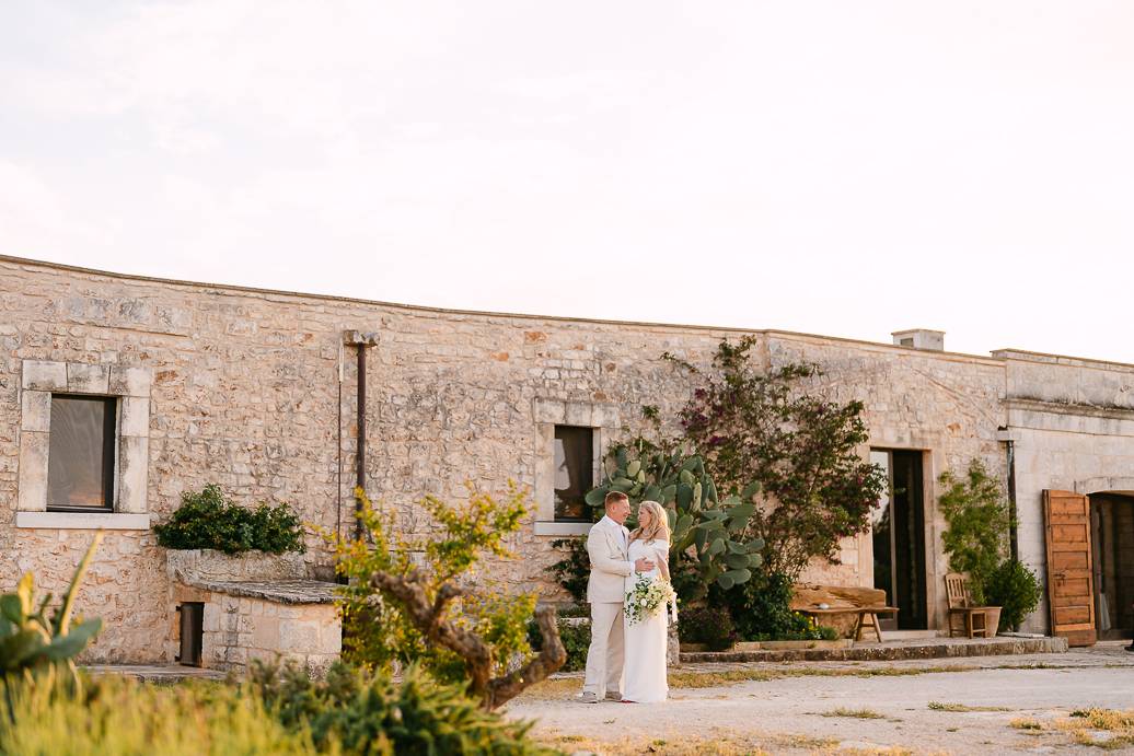 Dopo il rito, ci siamo dedicati a immortalare la loro giornata con fotografie spontanee e ricercate. Ogni angolo della Masseria San Paolo Grande è diventato protagonista: dai muri bianchi che riflettevano la luce calda del pomeriggio, alle volte caratteristiche e agli ulivi secolari, tutto ha contribuito a raccontare la storia d’amore di Franky e Erin. In un elopement, ogni dettaglio diventa poesia visiva, e ogni scatto conserva un ricordo autentico della loro intimità.