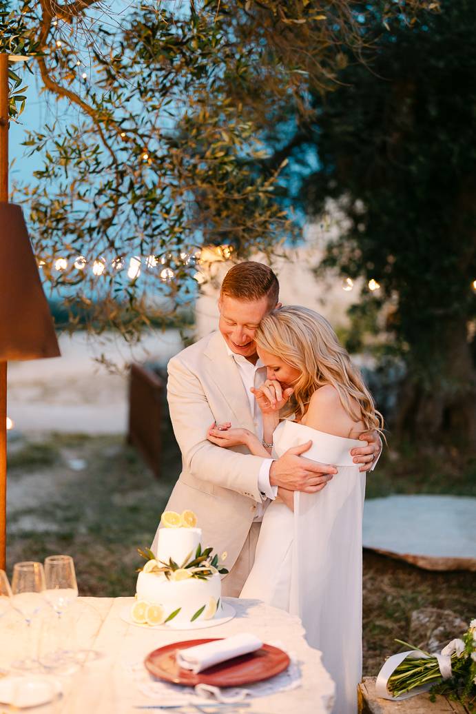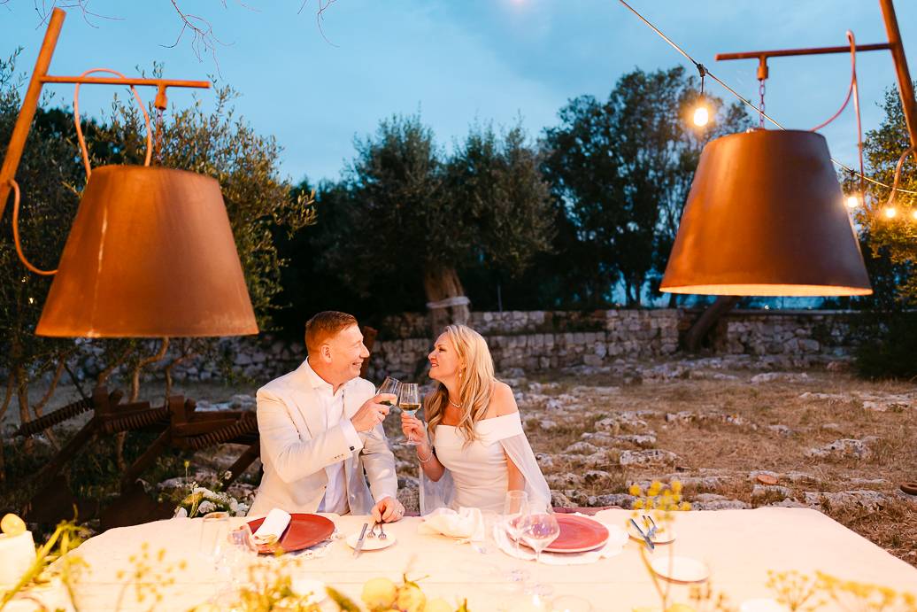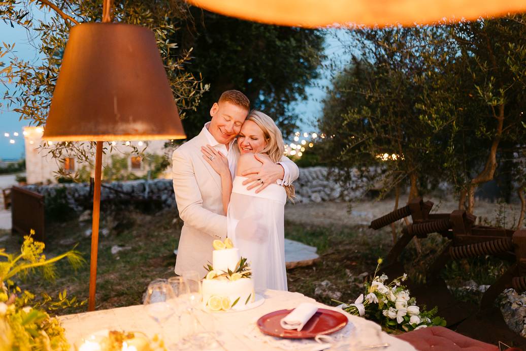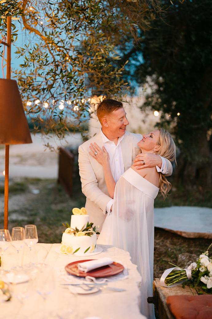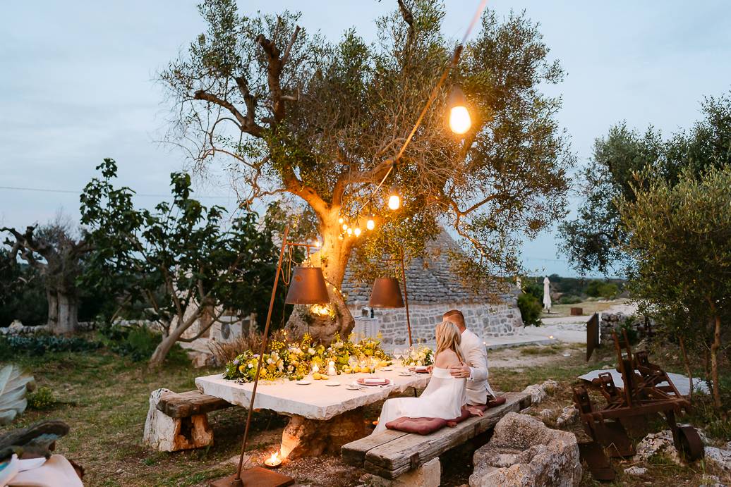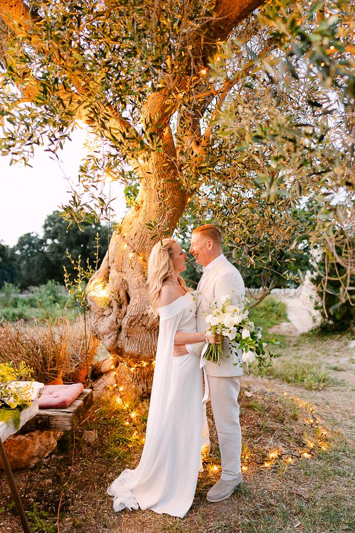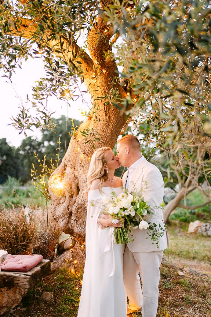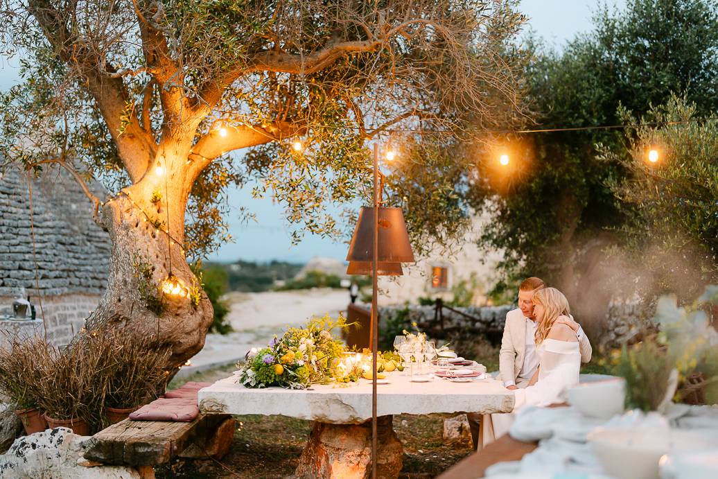 La giornata si è chiusa con una cena intima sotto un ulivo secolare, illuminata dalle luci soffuse e dal calore dell’affetto reciproco. In un matrimonio intimo, momenti come questi diventano memorabili: non servono grandi banchetti o decorazioni sfarzose, perché la vera magia sta nella connessione tra due persone e nella gioia condivisa.