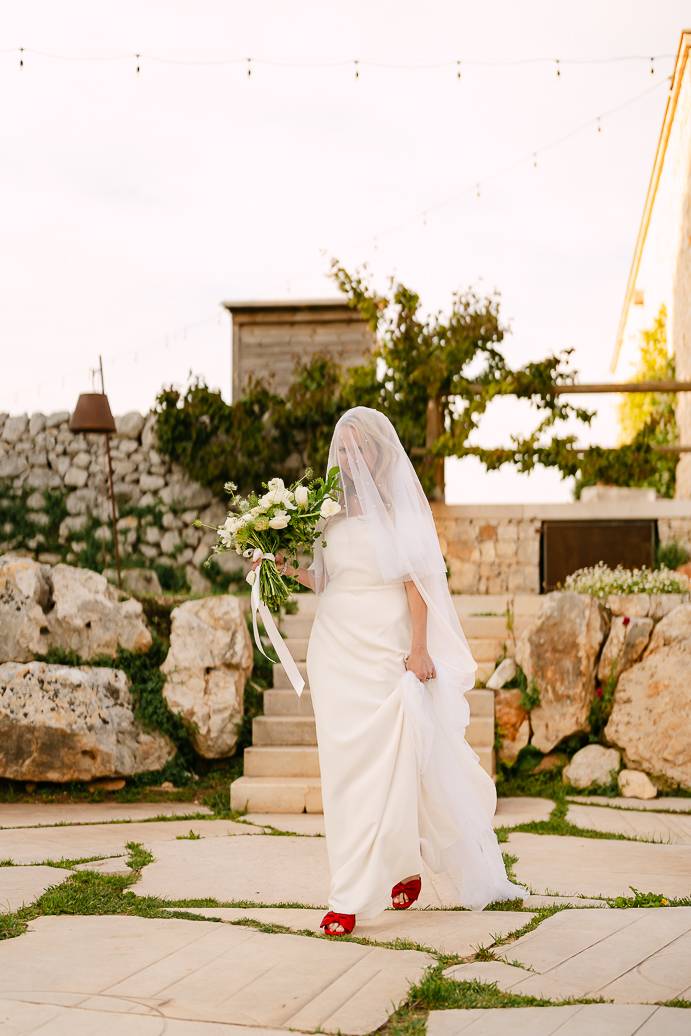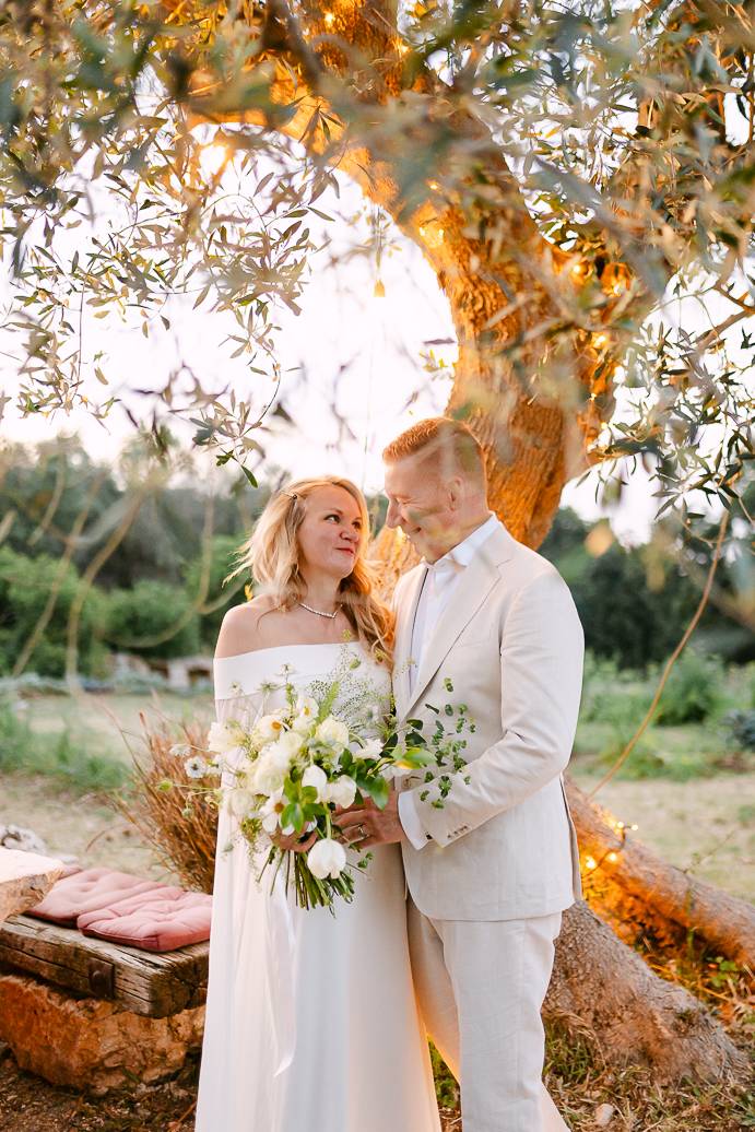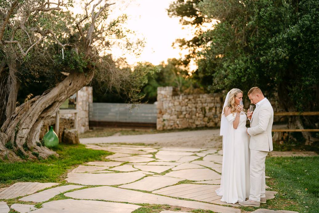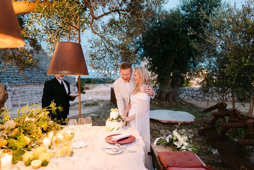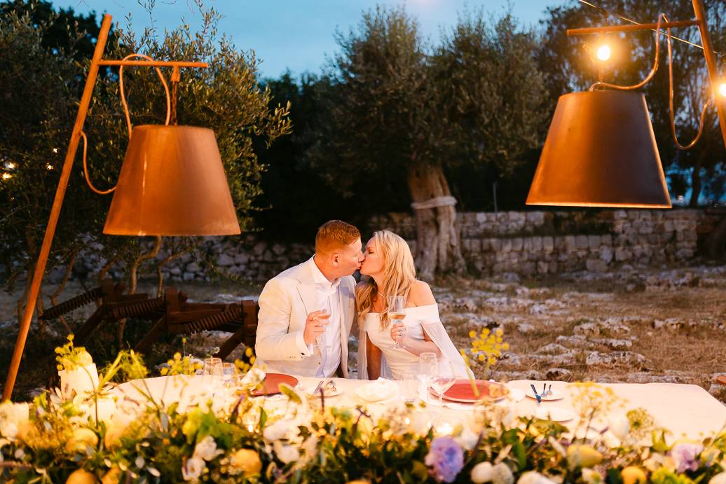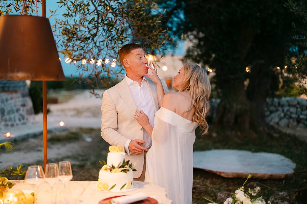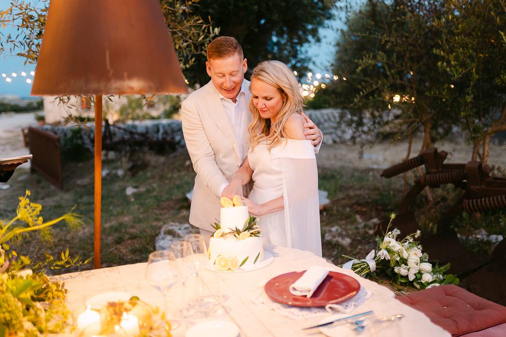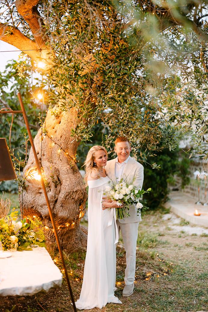 La giornata si è chiusa con una cena intima sotto un ulivo secolare, illuminata dalle luci soffuse e dal calore dell’affetto reciproco. In un matrimonio intimo, momenti come questi diventano memorabili: non servono grandi banchetti o decorazioni sfarzose, perché la vera magia sta nella connessione tra due persone e nella gioia condivisa.