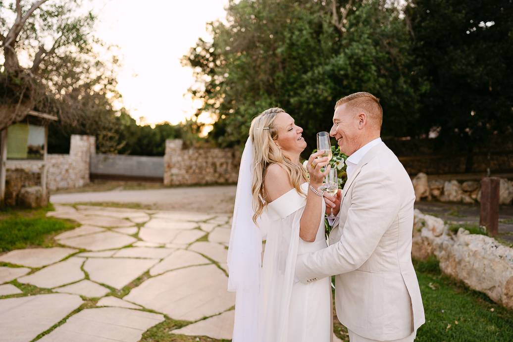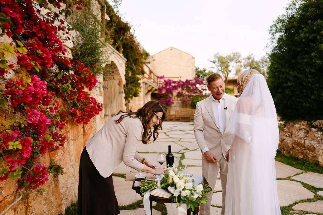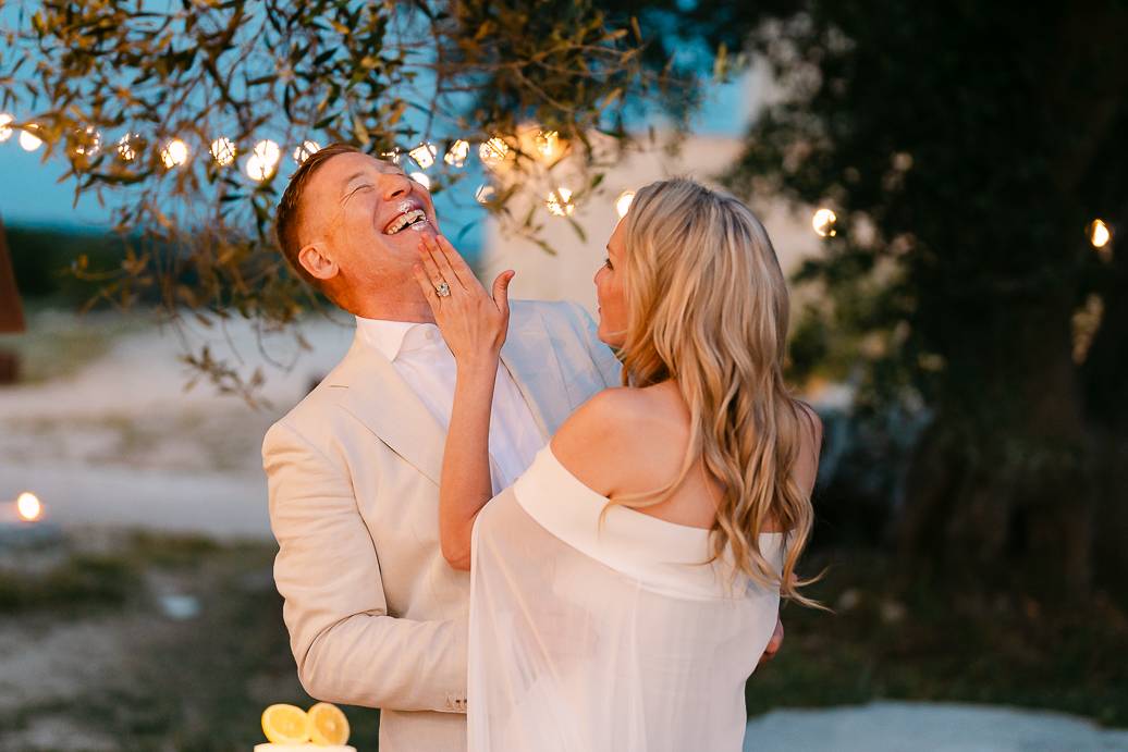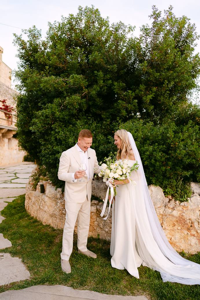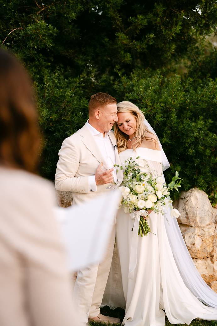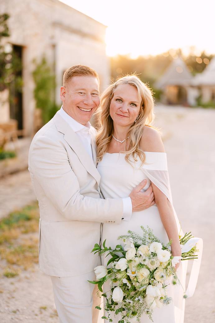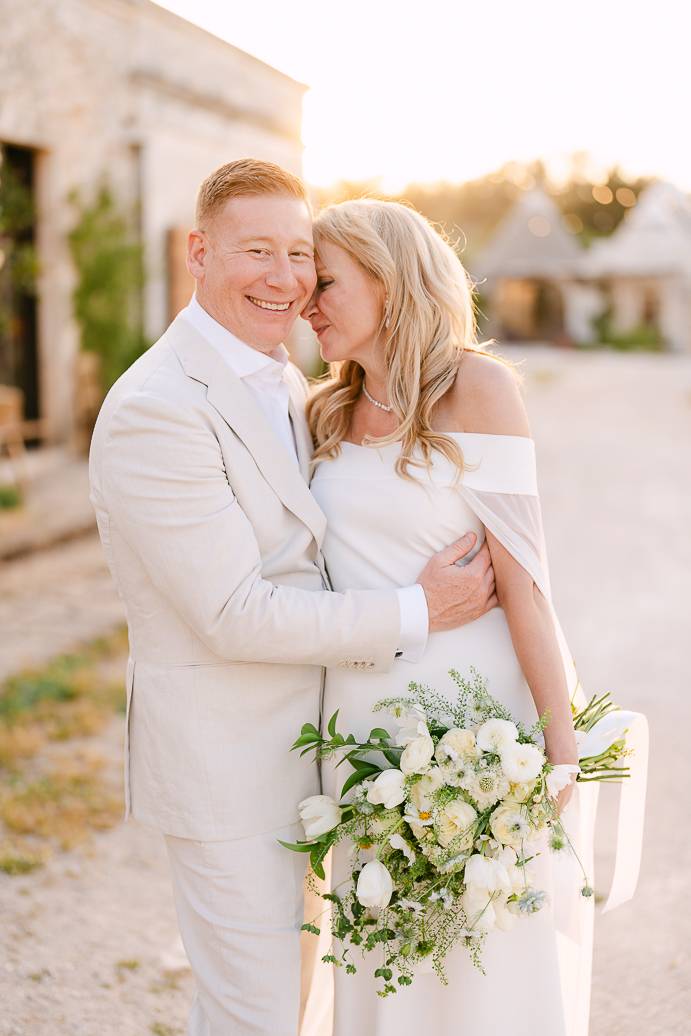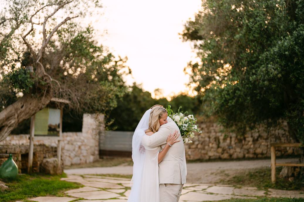 Quando è arrivato il momento del rito simbolico, la magia della Masseria San Paolo Grande ha creato l’atmosfera perfetta. Circondati dal bianco delle mura e dal verde degli ulivi, Franky e Erin si sono scambiati promesse sincere, profondamente sentite. Tra sorrisi, lacrime e abbracci, ogni parola pronunciata ha fatto vibrare il cuore: un elopement non ha bisogno di grandi platee per trasmettere emozione, perché l’amore autentico basta a riempire l’aria.