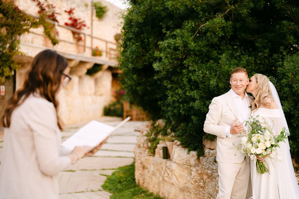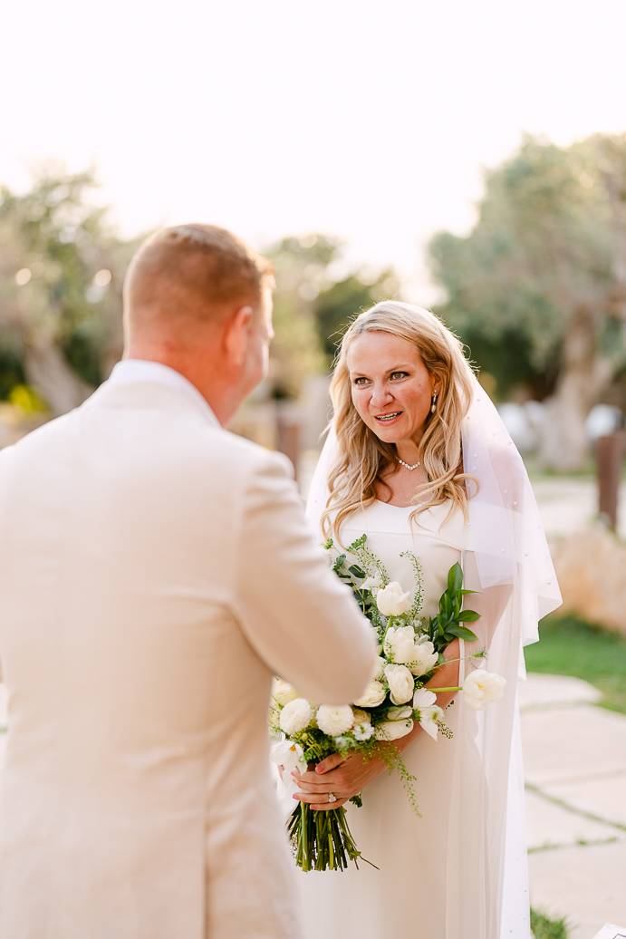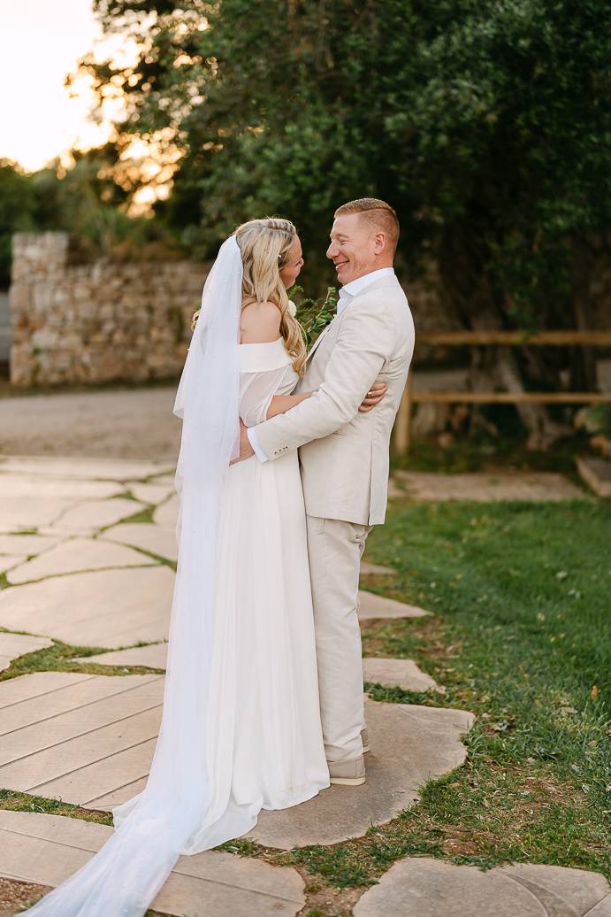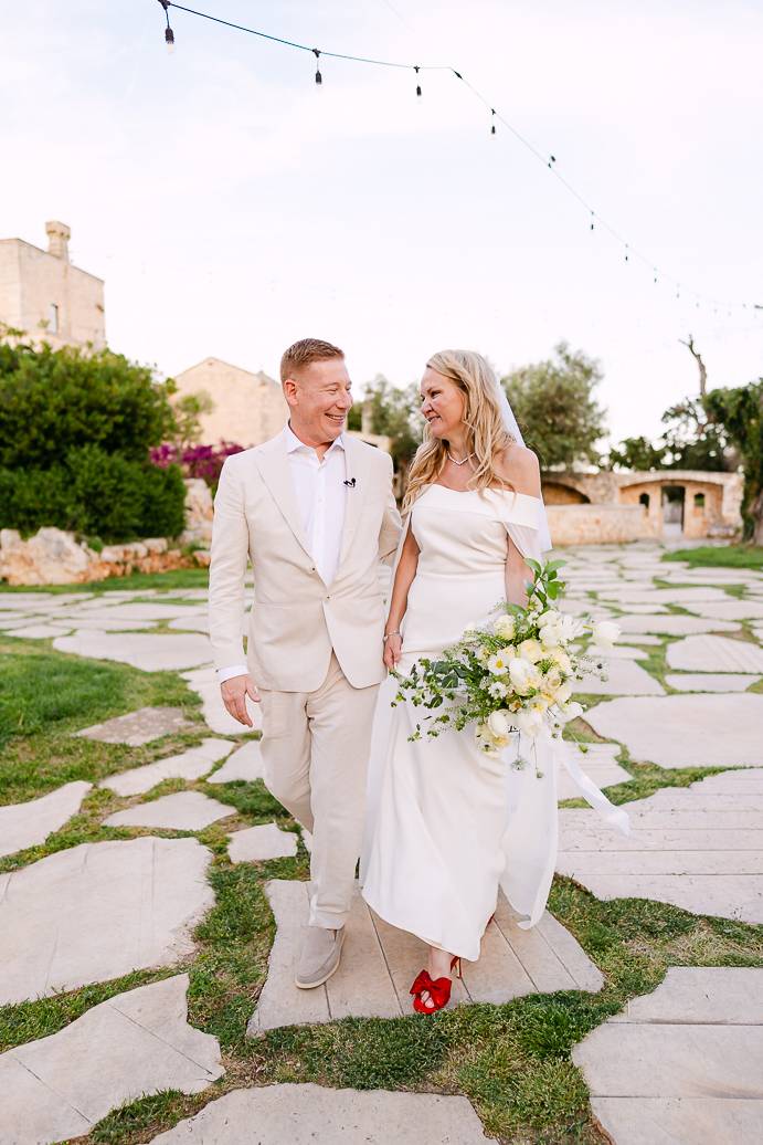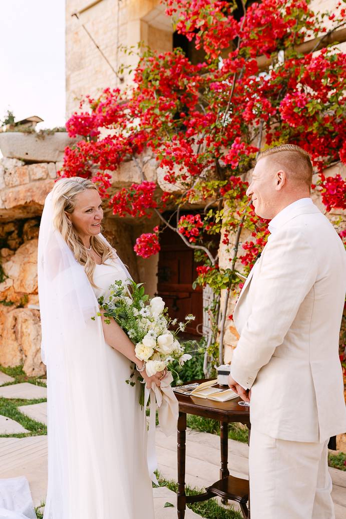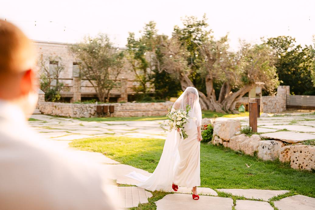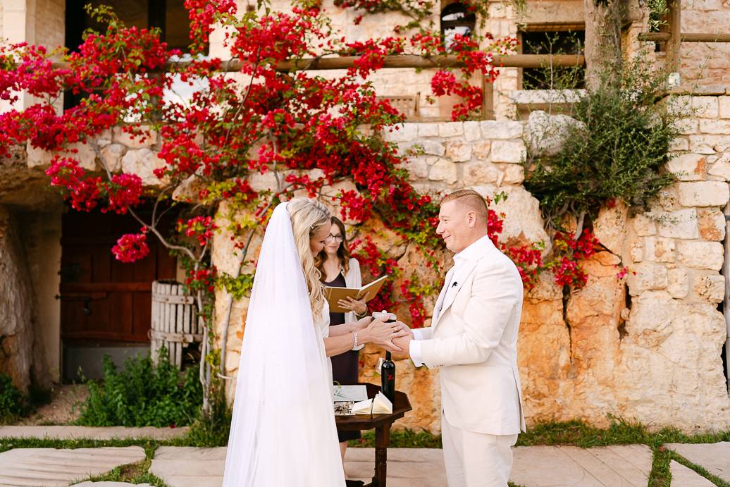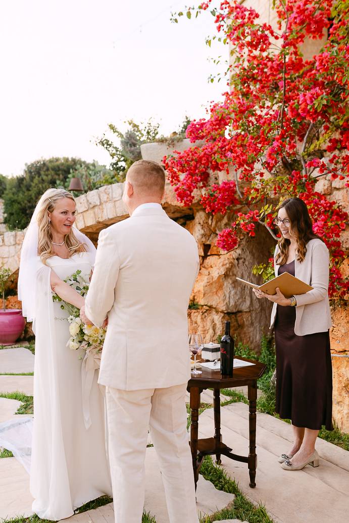 Quando è arrivato il momento del rito simbolico, la magia della Masseria San Paolo Grande ha creato l’atmosfera perfetta. Circondati dal bianco delle mura e dal verde degli ulivi, Franky e Erin si sono scambiati promesse sincere, profondamente sentite. Tra sorrisi, lacrime e abbracci, ogni parola pronunciata ha fatto vibrare il cuore: un elopement non ha bisogno di grandi platee per trasmettere emozione, perché l’amore autentico basta a riempire l’aria.