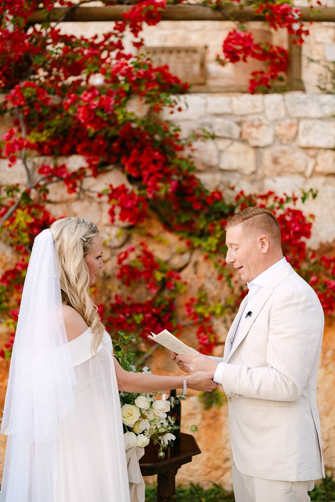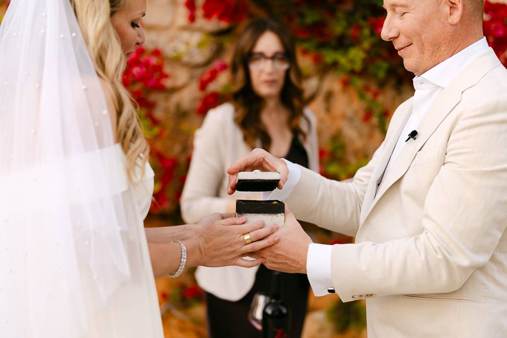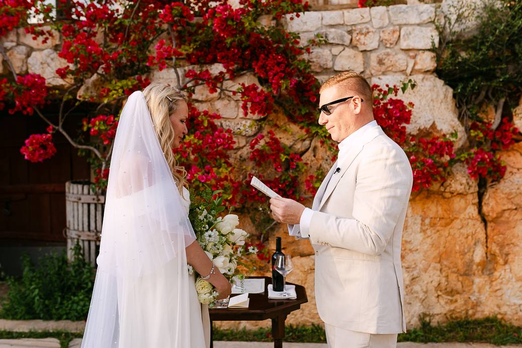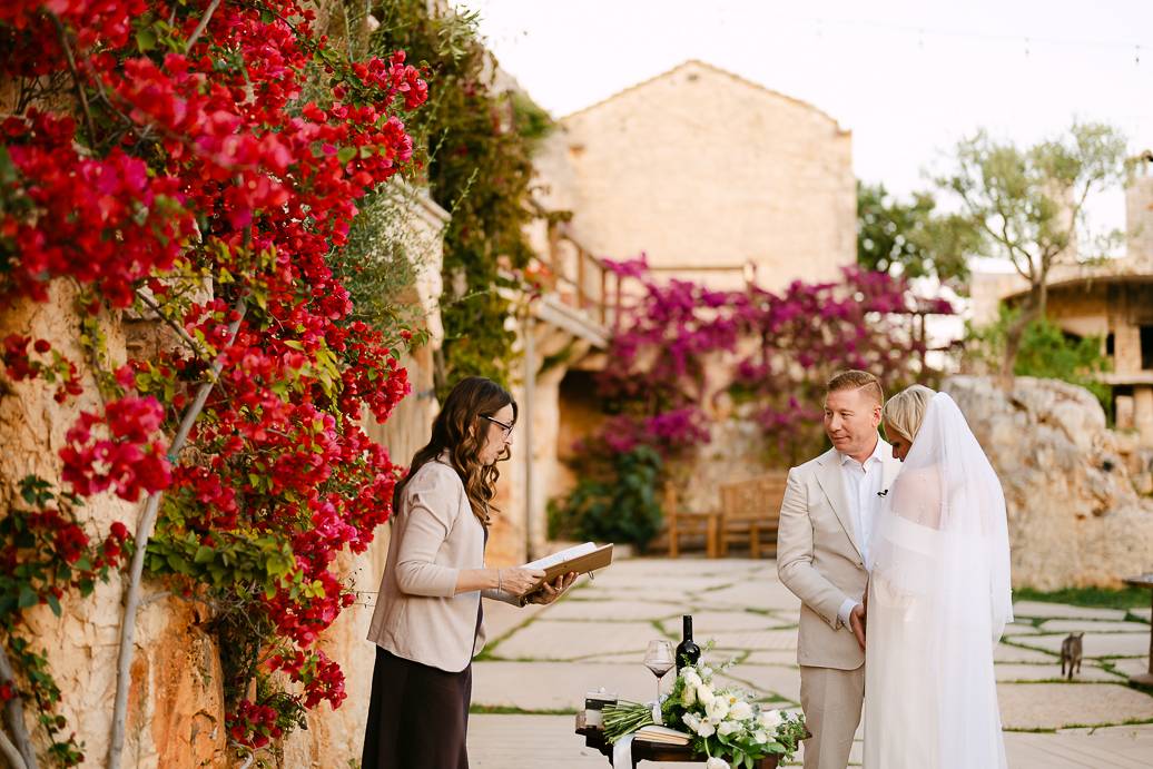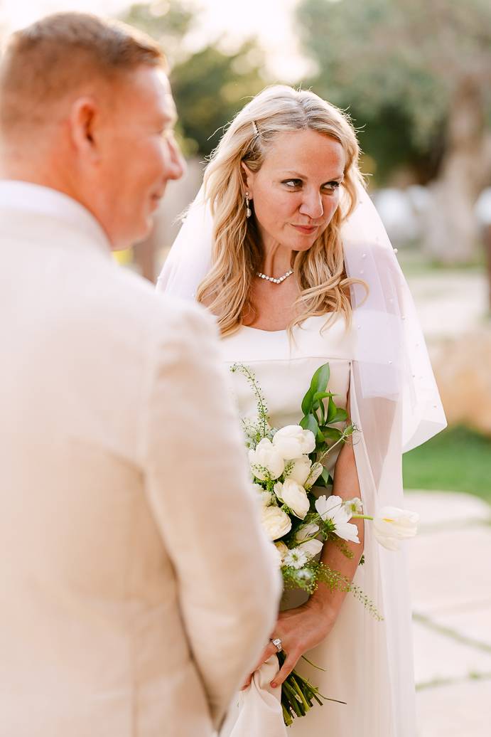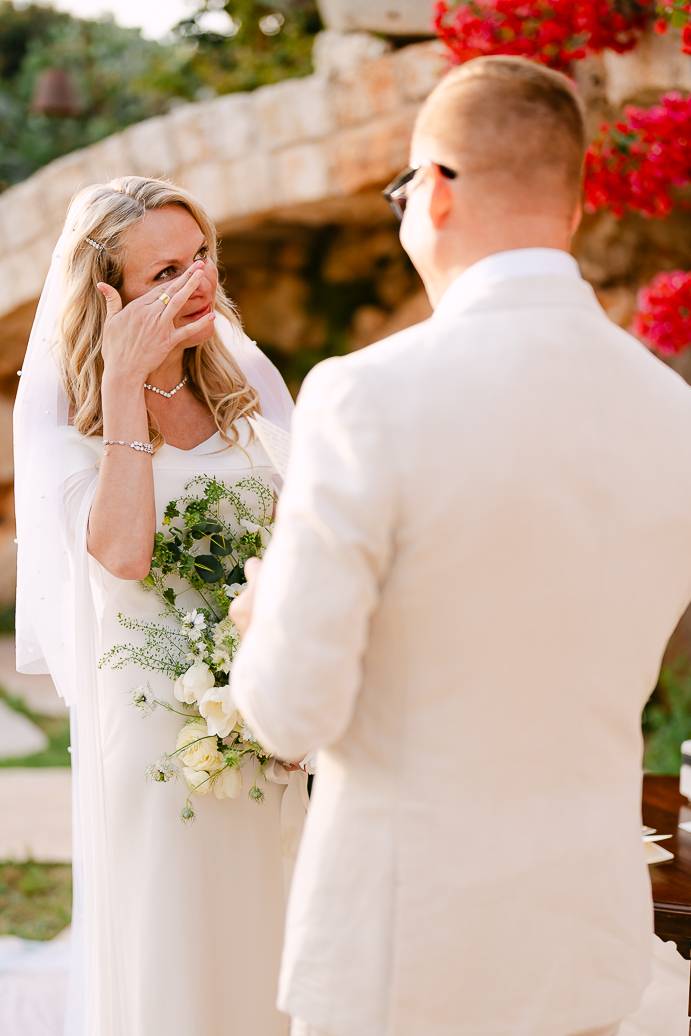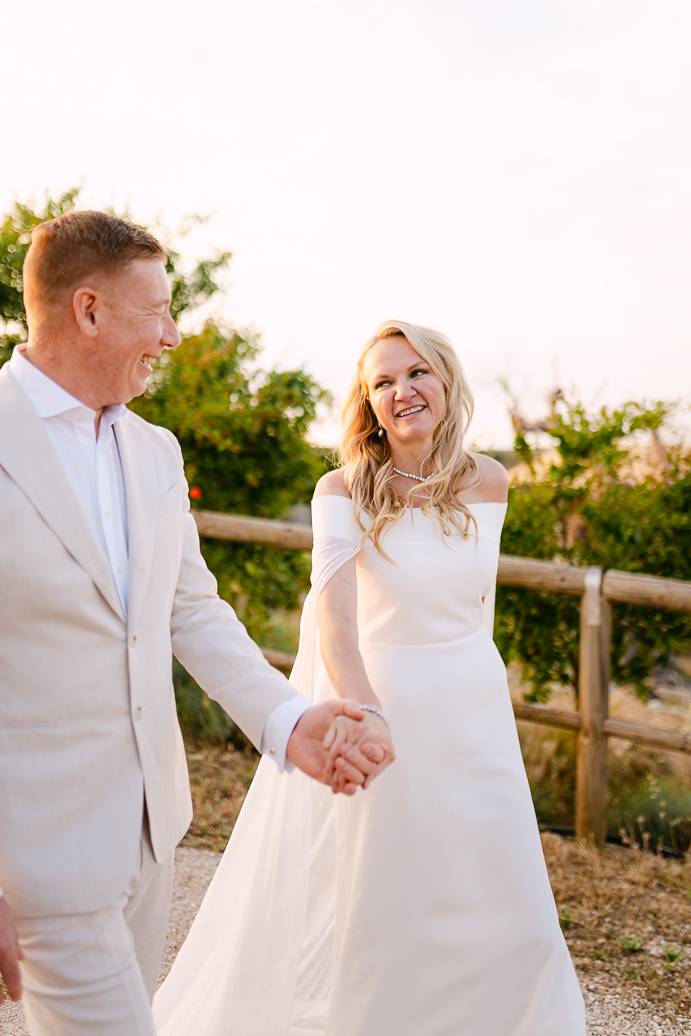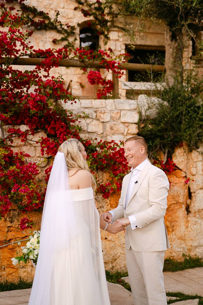 Quando è arrivato il momento del rito simbolico, la magia della Masseria San Paolo Grande ha creato l’atmosfera perfetta. Circondati dal bianco delle mura e dal verde degli ulivi, Franky e Erin si sono scambiati promesse sincere, profondamente sentite. Tra sorrisi, lacrime e abbracci, ogni parola pronunciata ha fatto vibrare il cuore: un elopement non ha bisogno di grandi platee per trasmettere emozione, perché l’amore autentico basta a riempire l’aria.